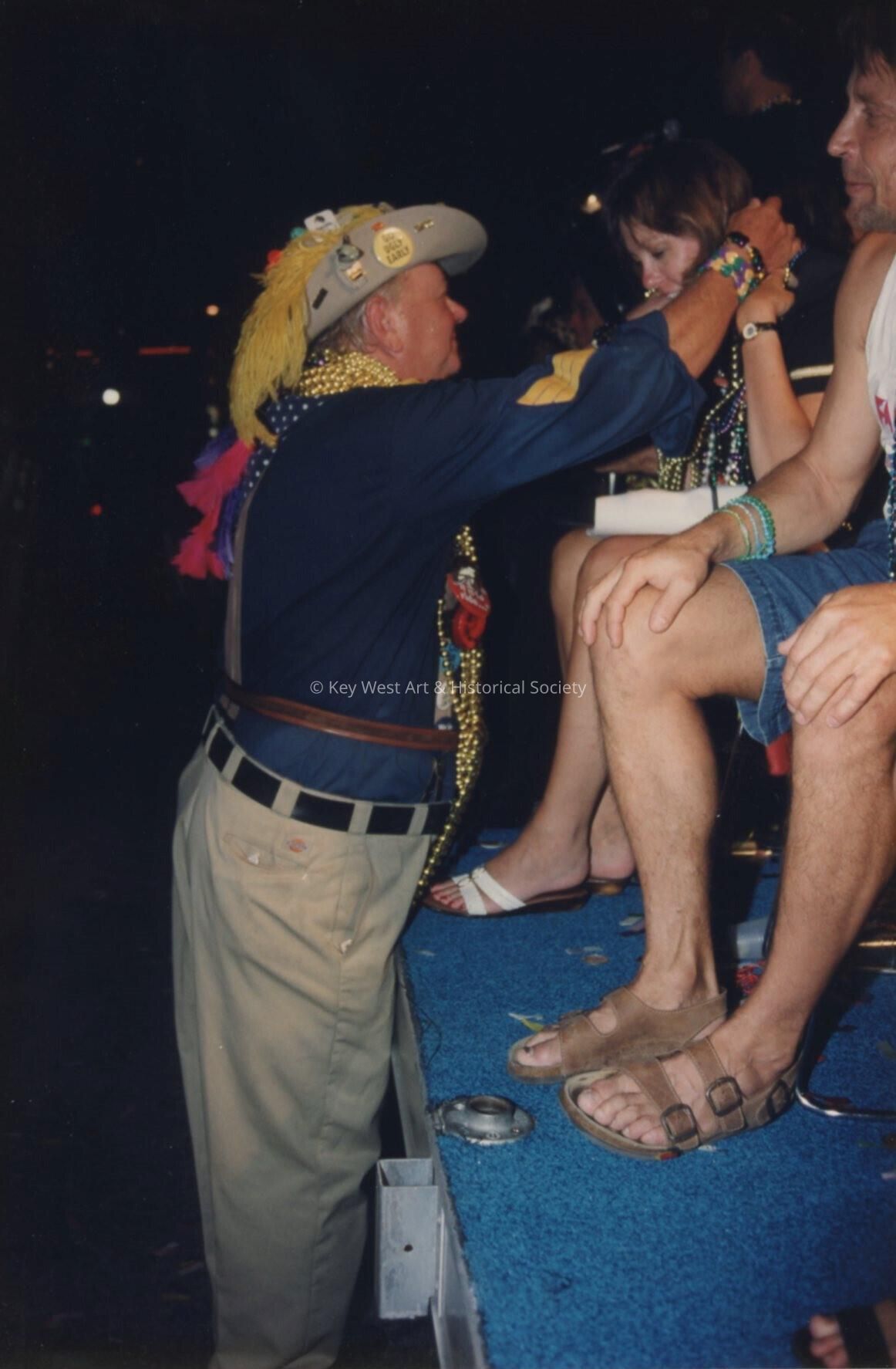 Unknown man dressed giving someone beads.