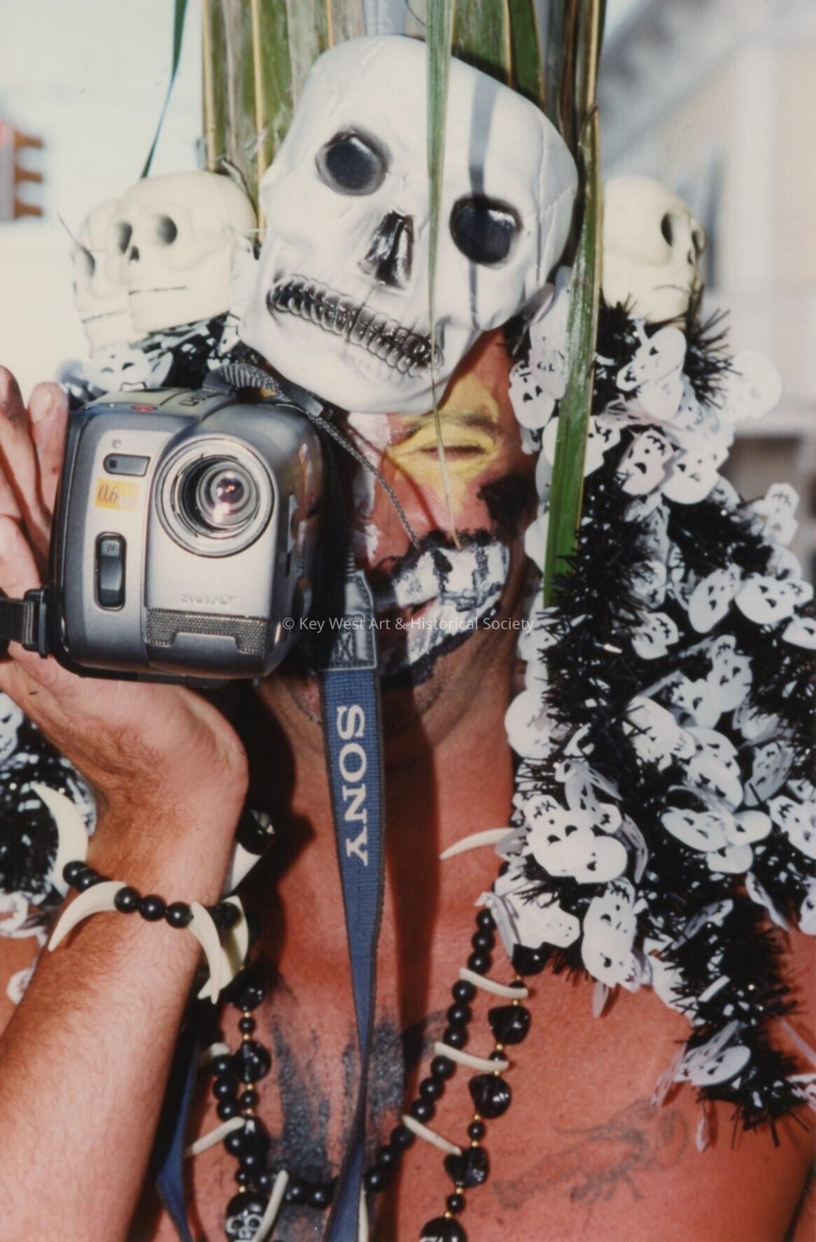 Unknown man dressed up holding a video camera.Entry/Object ID