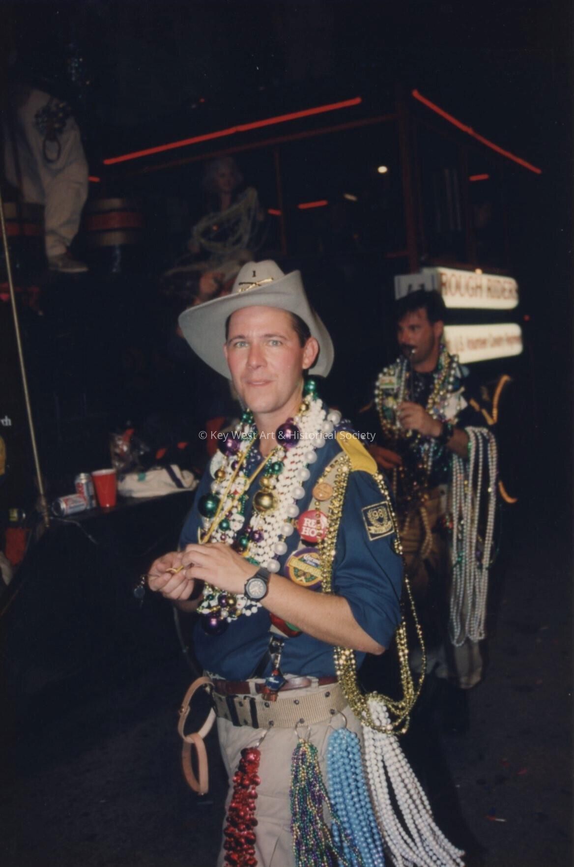Unknown man dressed up walking next to a float with tons of beads.Collection