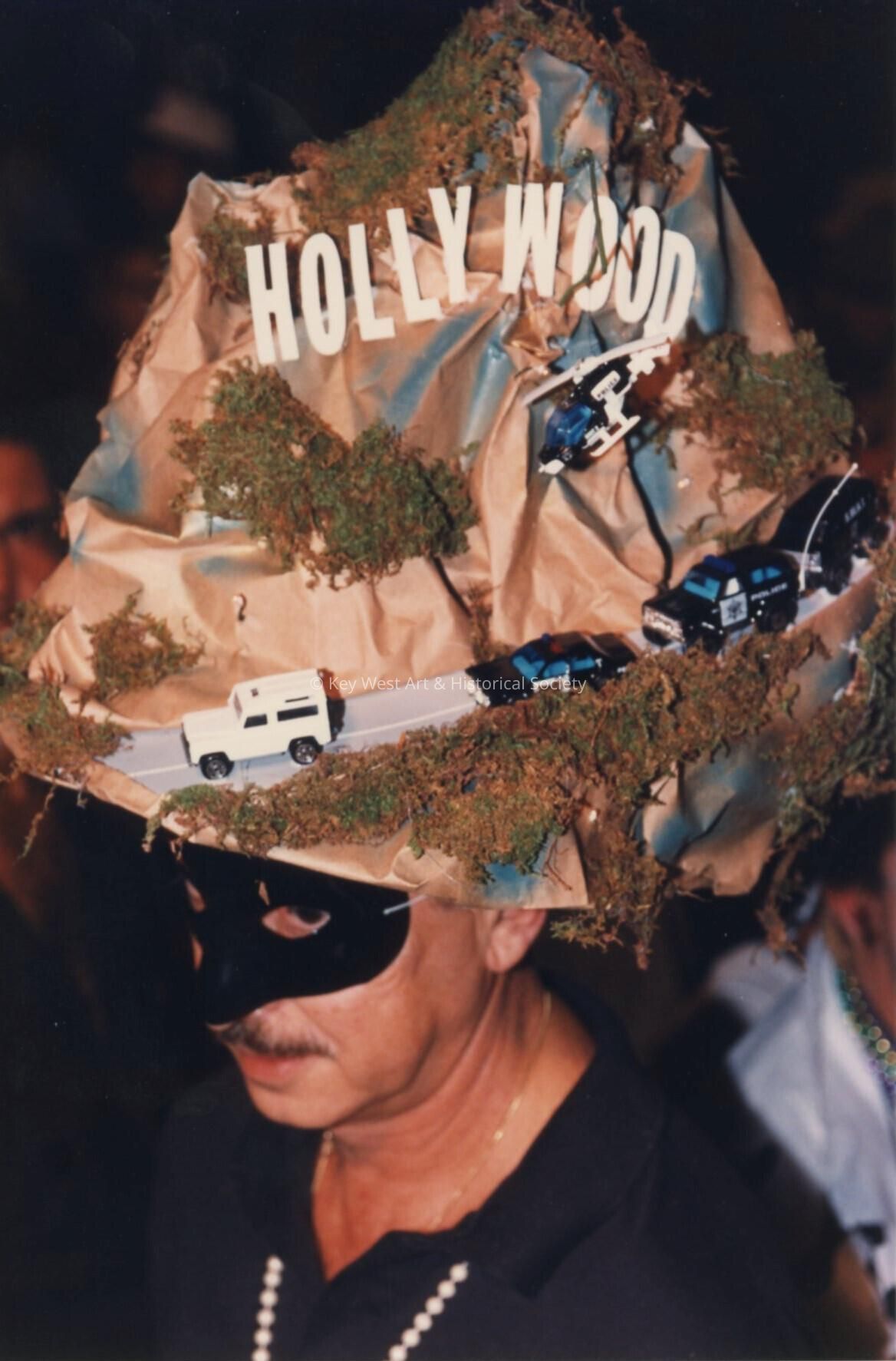 Unknown man dressed up with a head piece on of the Hollywood sign.Collection