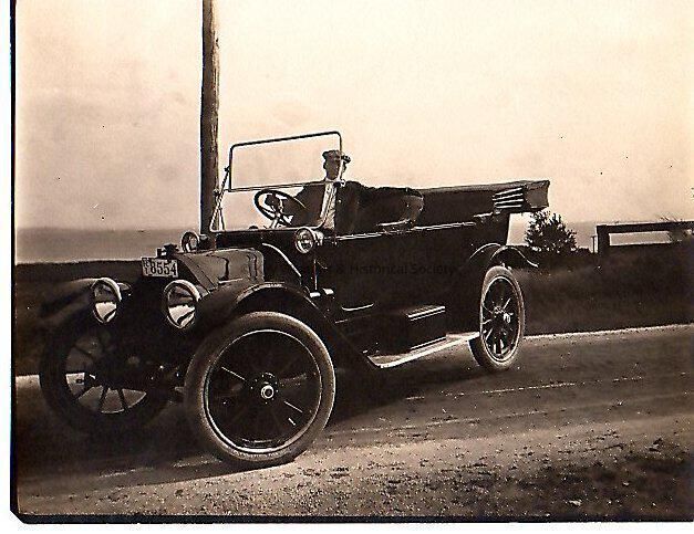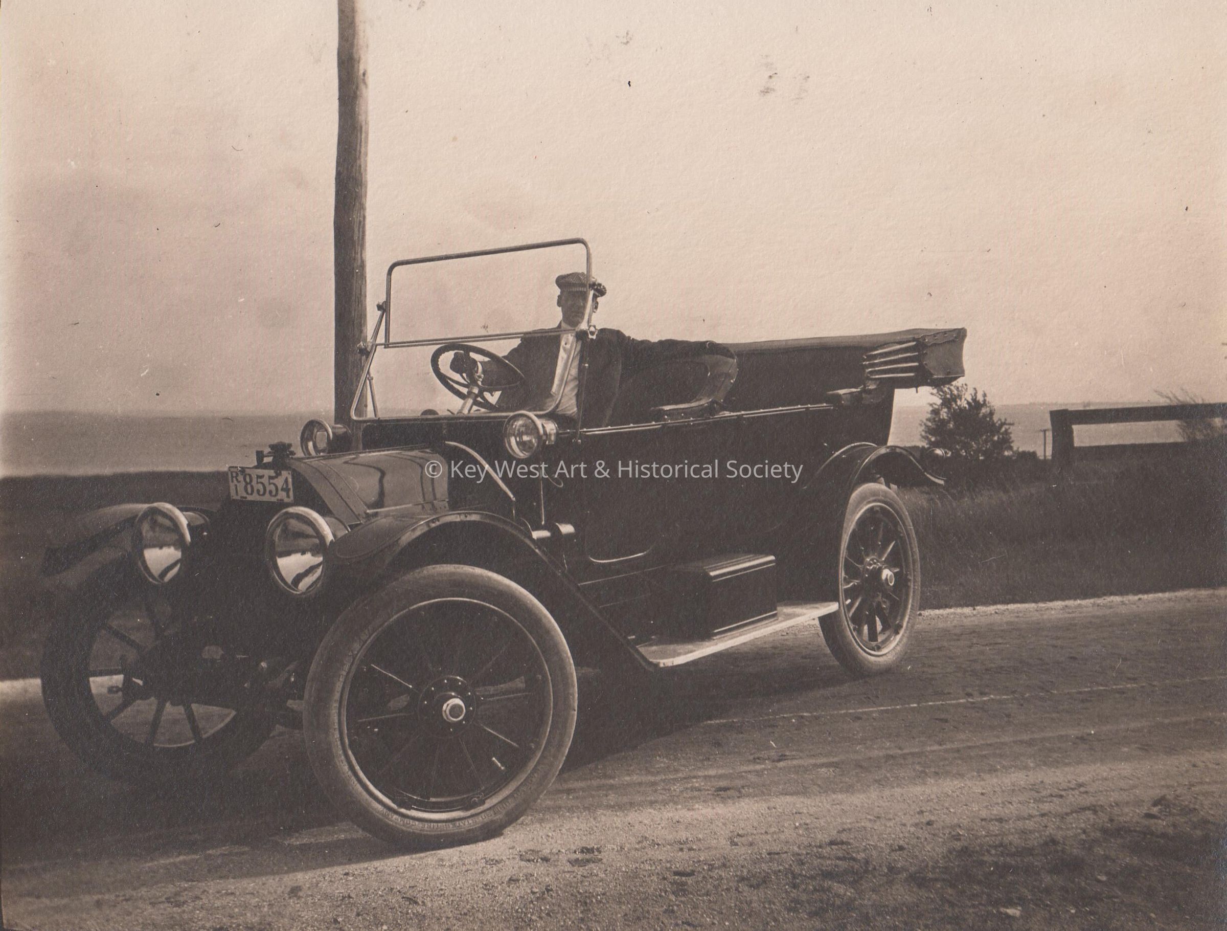 Black and white photograph of an unknown man in a car with the license plate of RI 8554.Collection