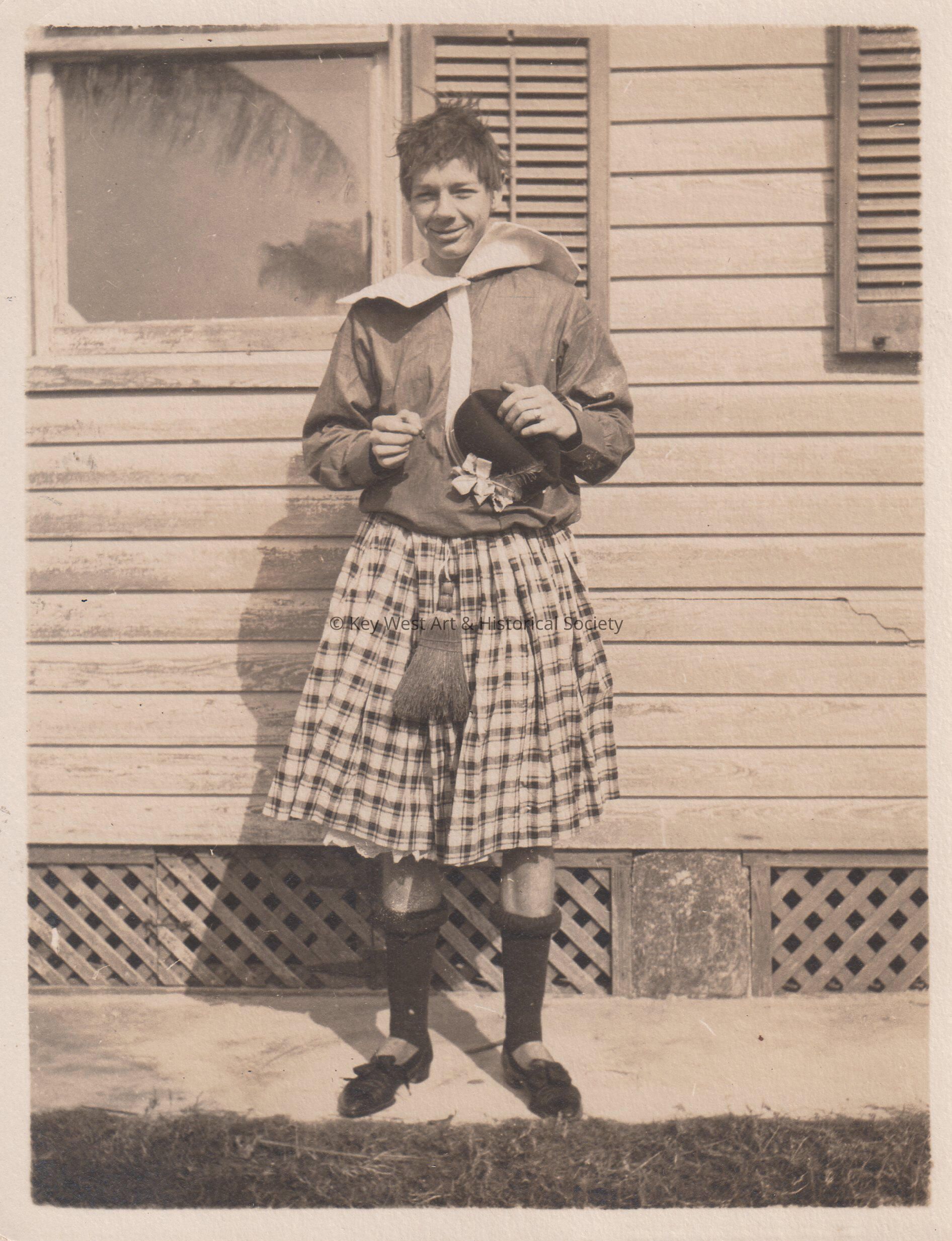 Black and white photo of a man standing in front of a house wearing a kiltCollection