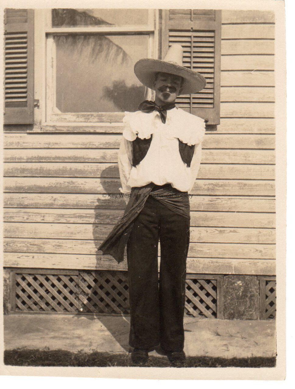 Black and white photo of a man standing in front of a house wearing a Mexican costume.Collection