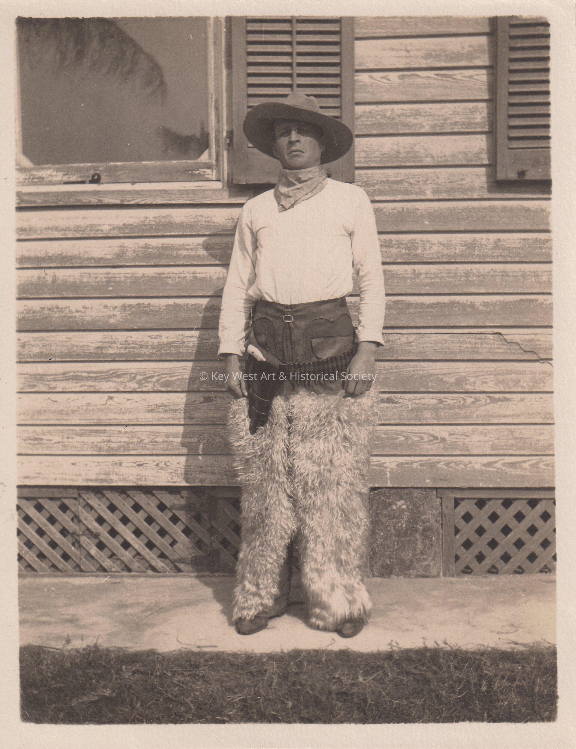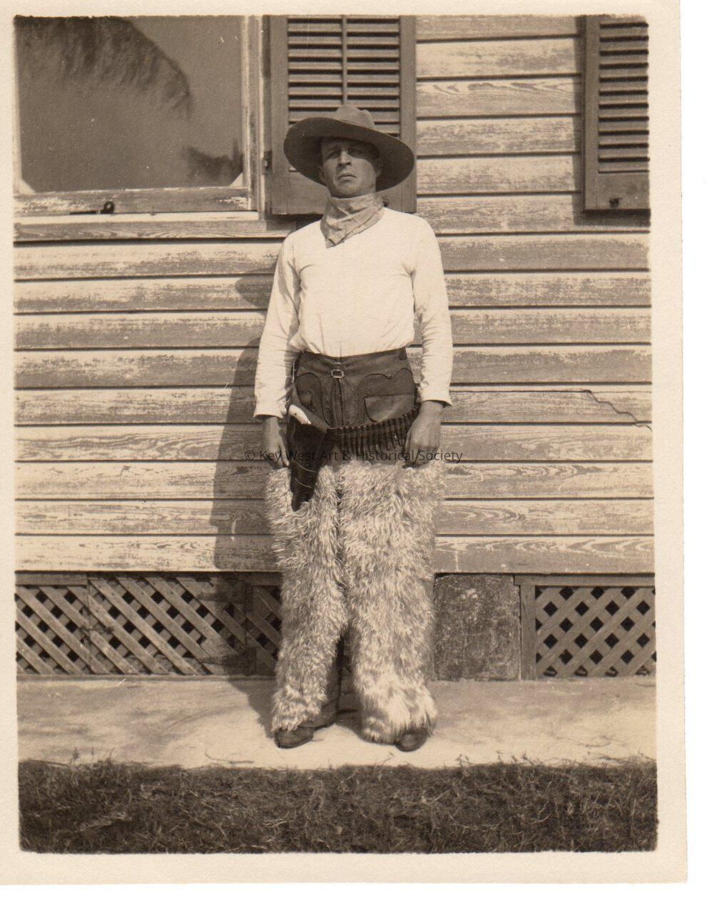 Black and white photo of a man standing in front of a house wearing a cowboy costume.Collection