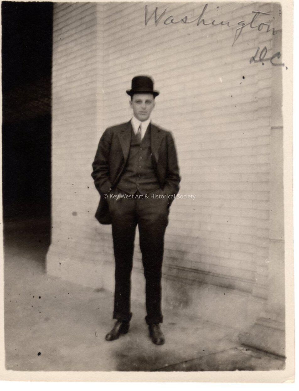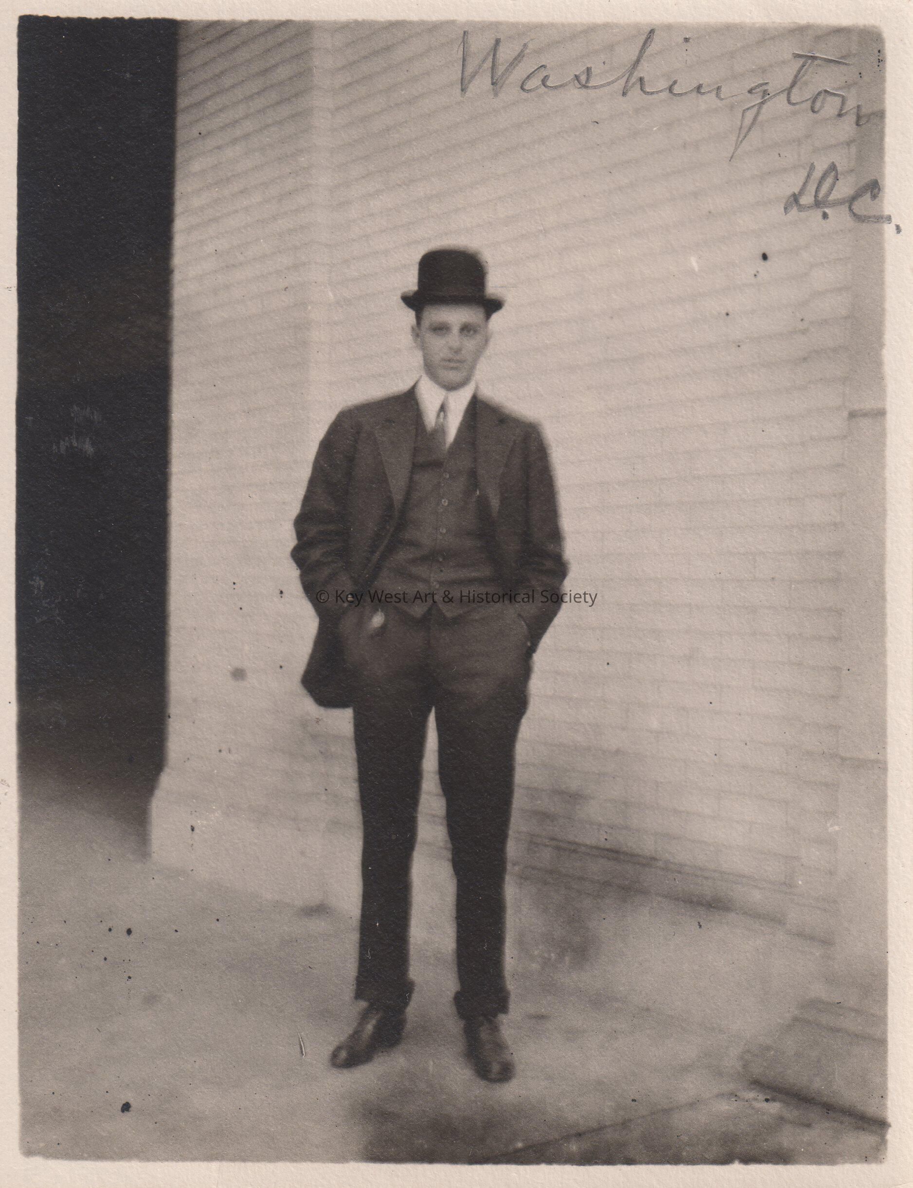 Black and white photo of a man in a suit and hat standing in front of a brick wall. Caption on photo reads "Washington D.C." Photograph taken for the Blackstone Gas and Electric Company.Collection