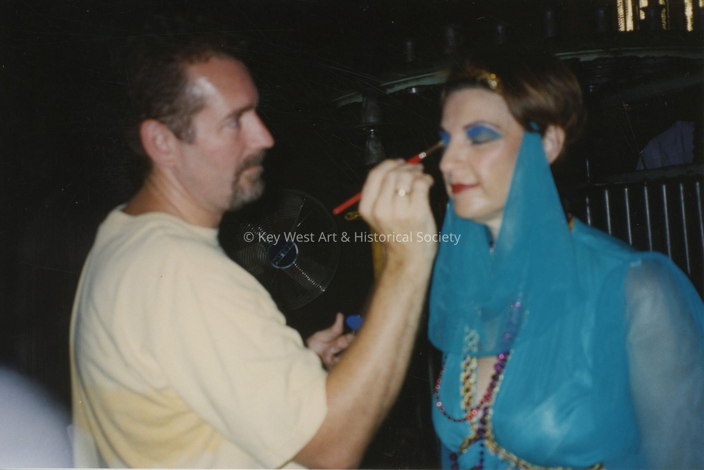Unknown man putting make up on an unknown woman who is dressed up.Entry/Object ID