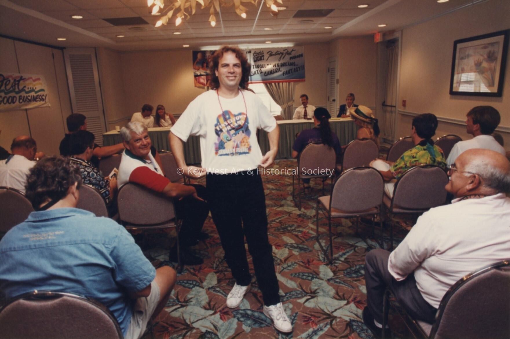 Unknown man showing off a Fantasy Fest t shirt at the meeting.Entry/Object ID