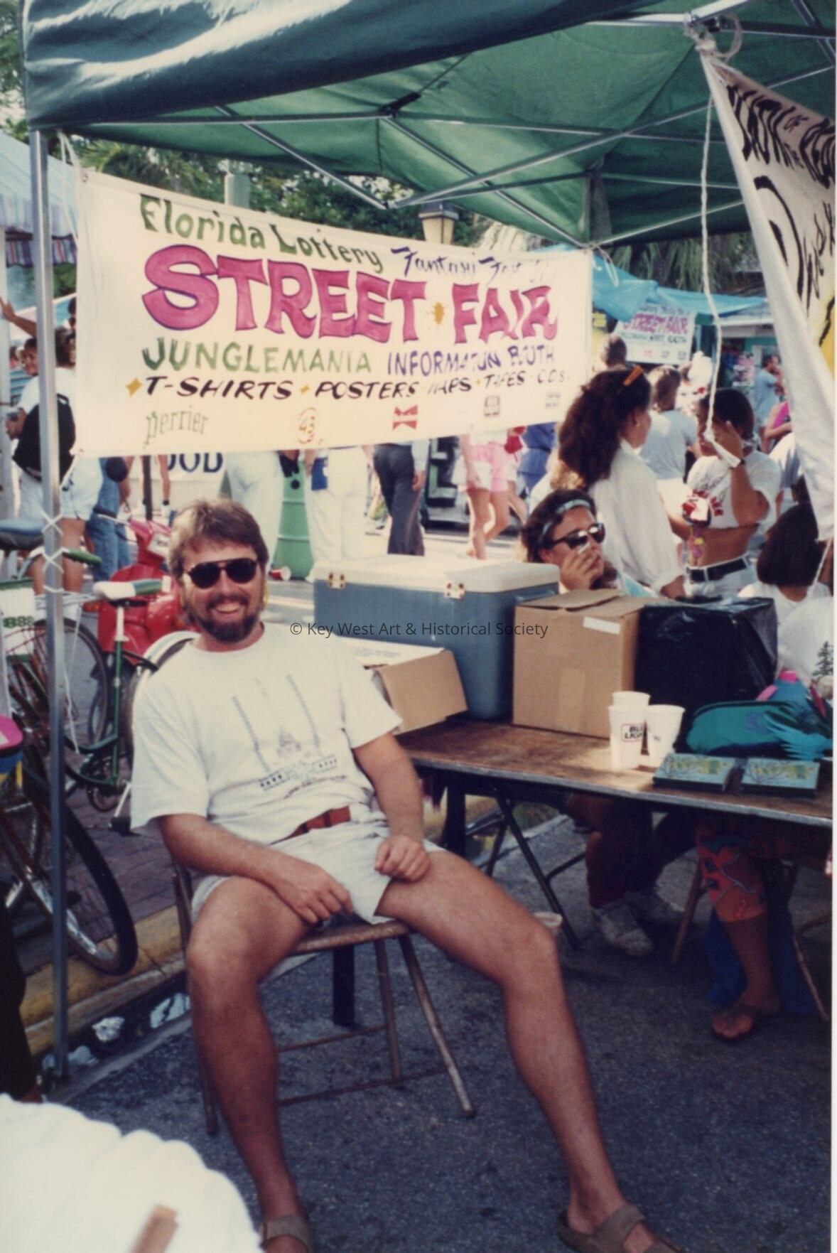 Unknown man sitting outside at the street fair.Entry/Object ID