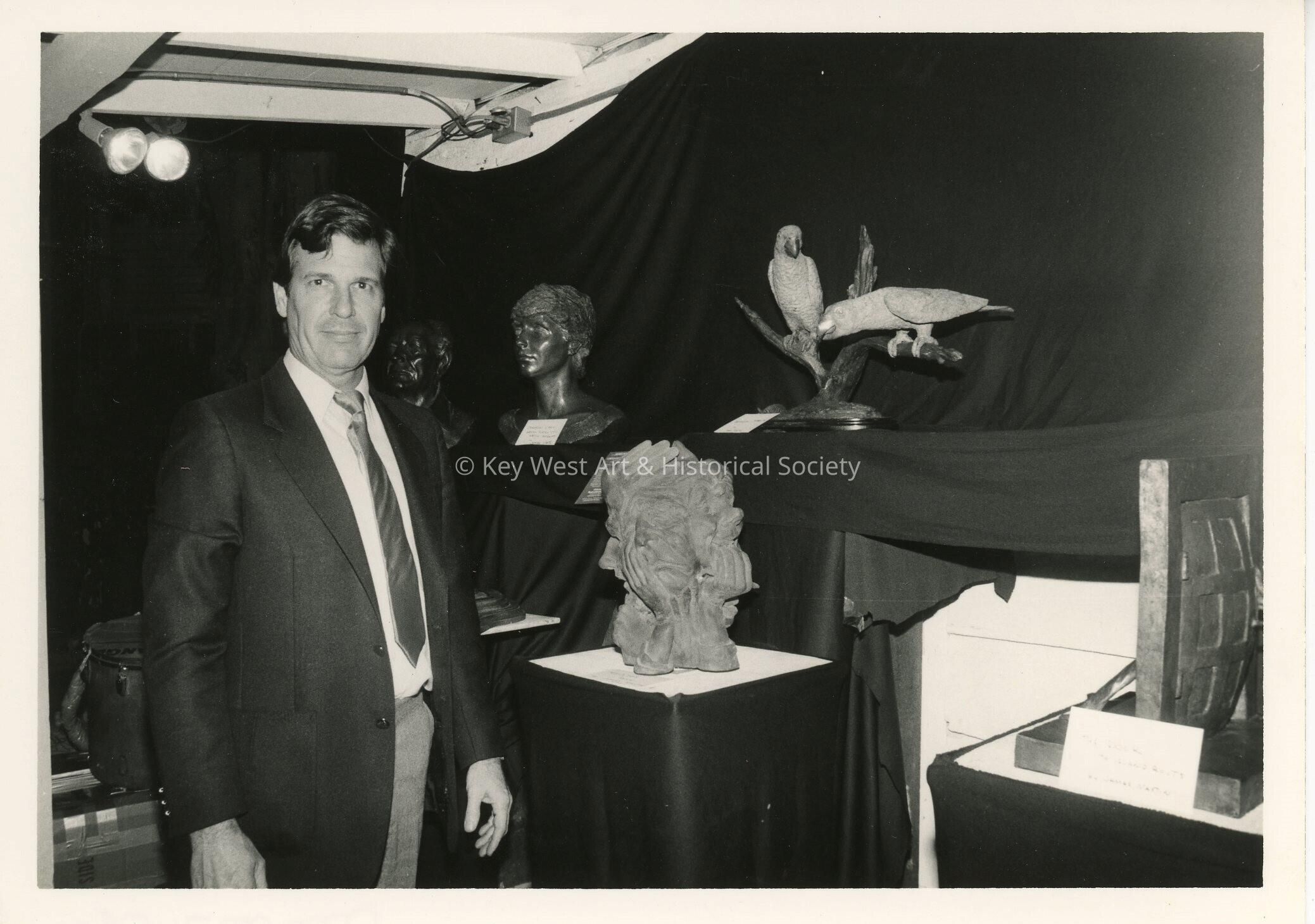 Unknown man standing next to sculptures.