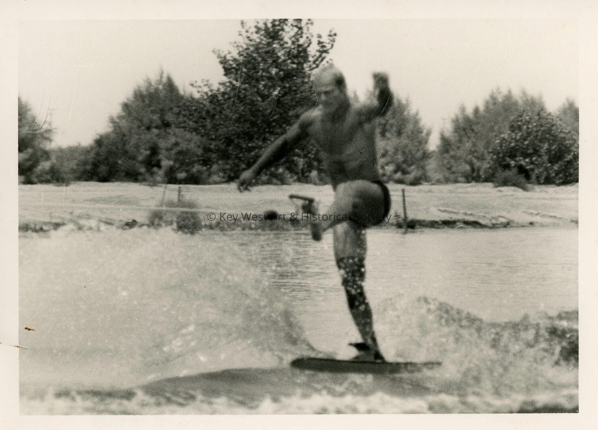 Black and white photograph of an unknown man water skiing.