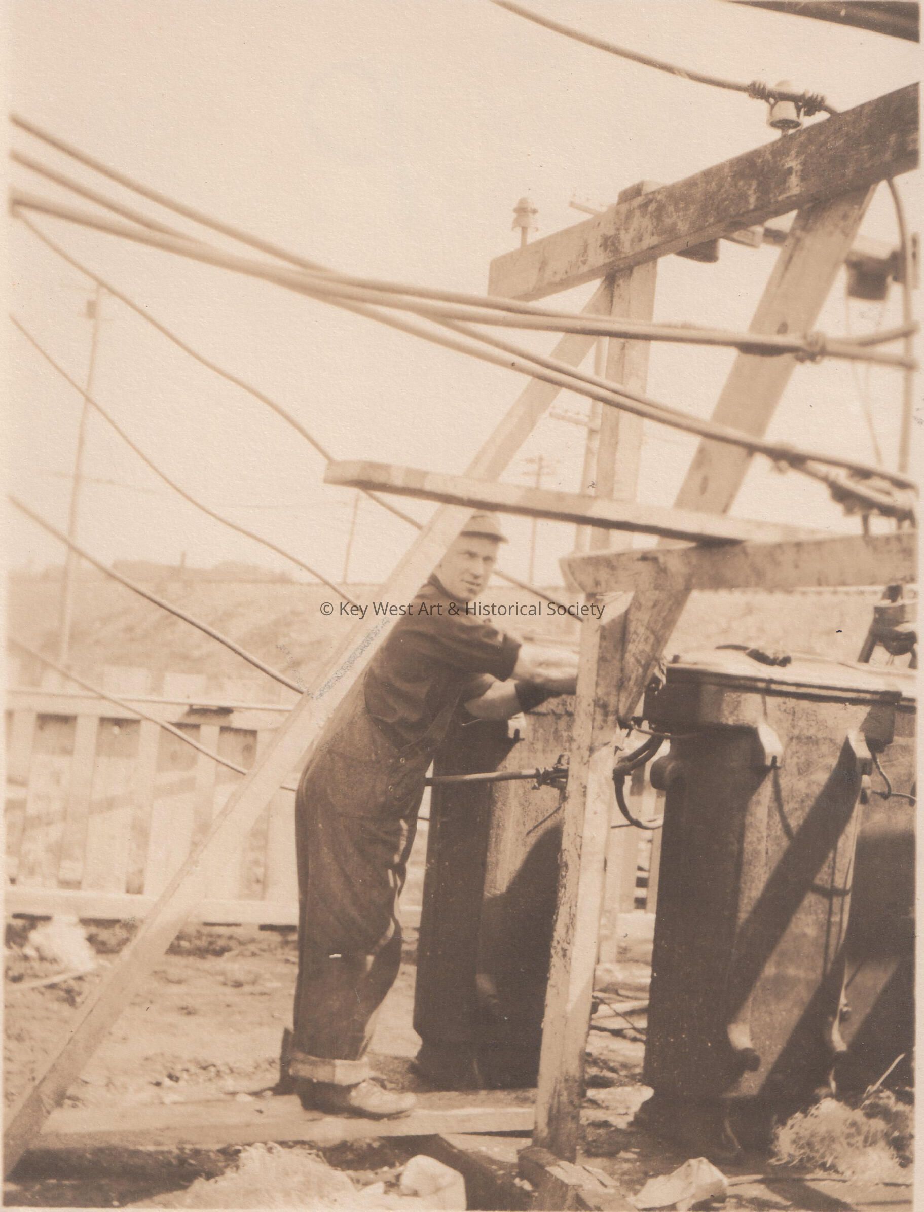 Black and white photo of a man fixing damaged electrical equipment caused by a storm. Blackstone Gas and Electric Co.Collection