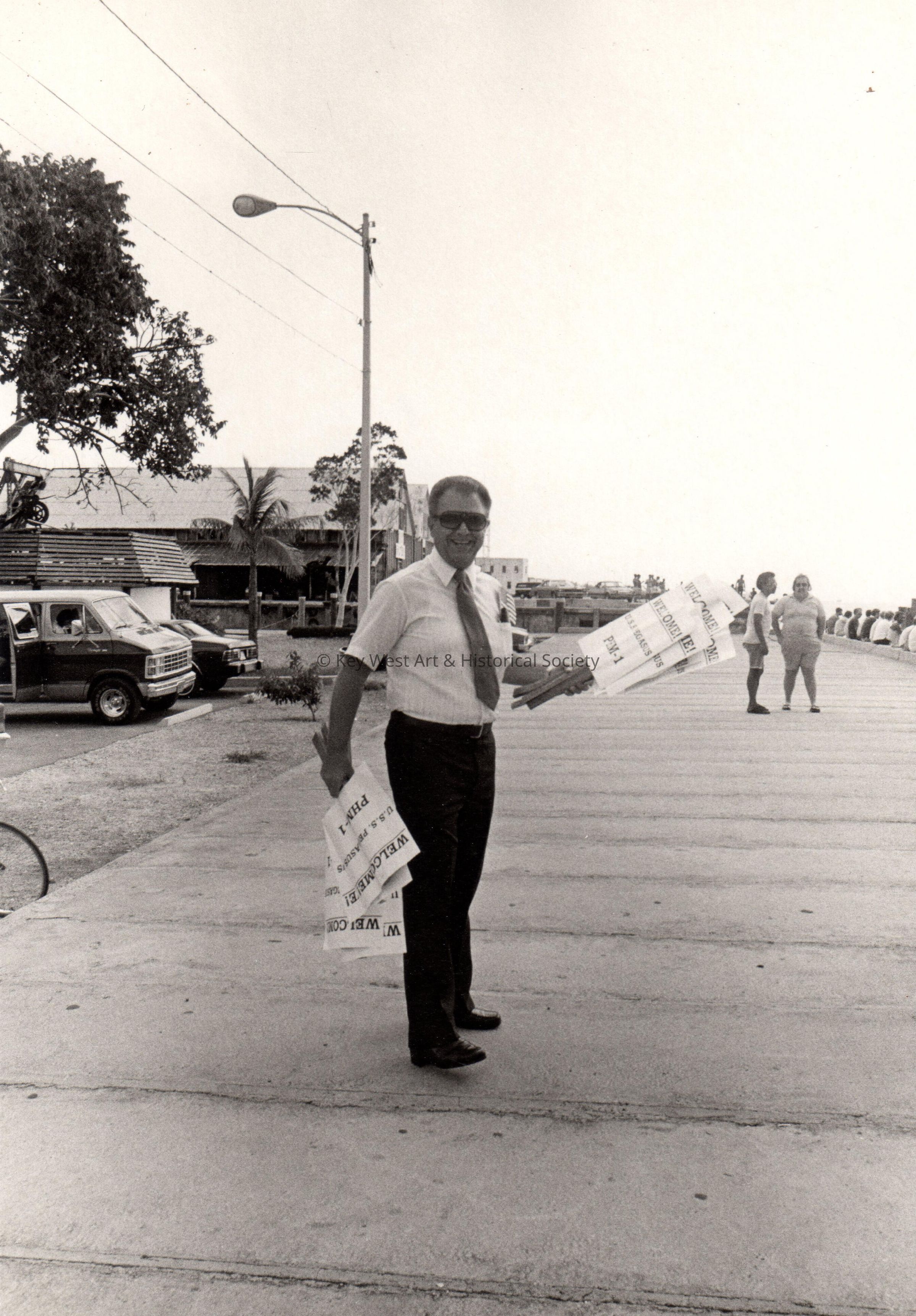 Unknown man with signs reading "Welcome USS Pegasus".