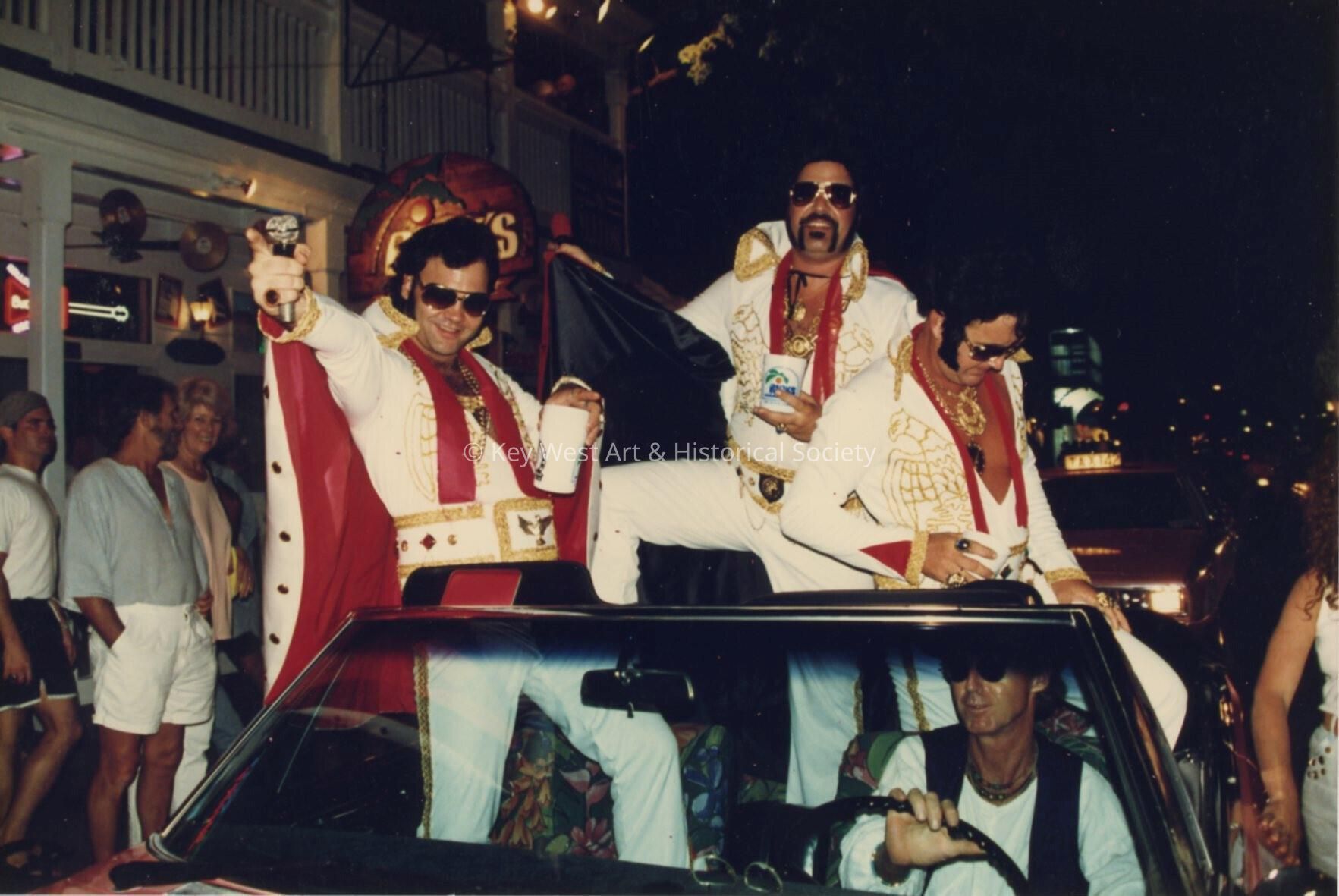 Unknown men dressed up in a convertible in the parade.Entry/Object ID