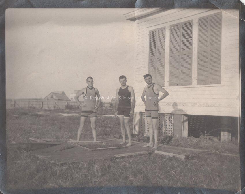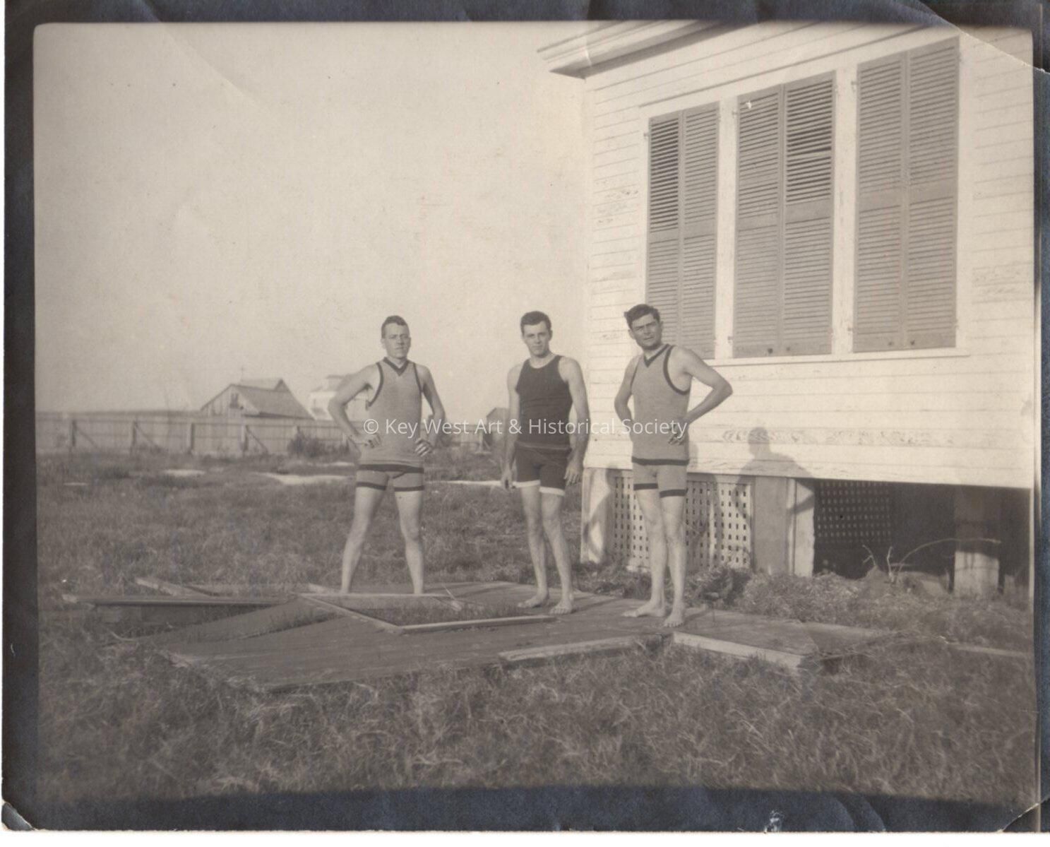 Black and white photograph of three unknown men in bathing suits. Photograph taken by the Blackstone Gas and Electric Company.Collection