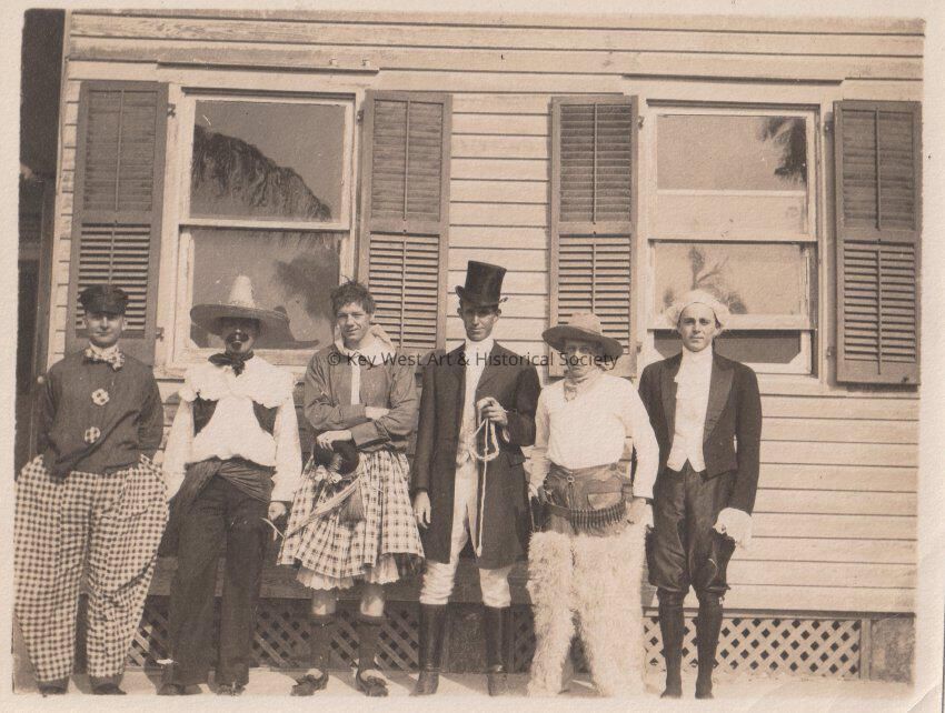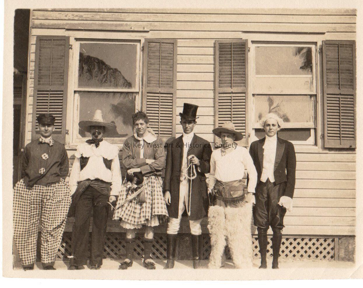 Black and white photograph of unknown men in costumes standing beside a house.Collection