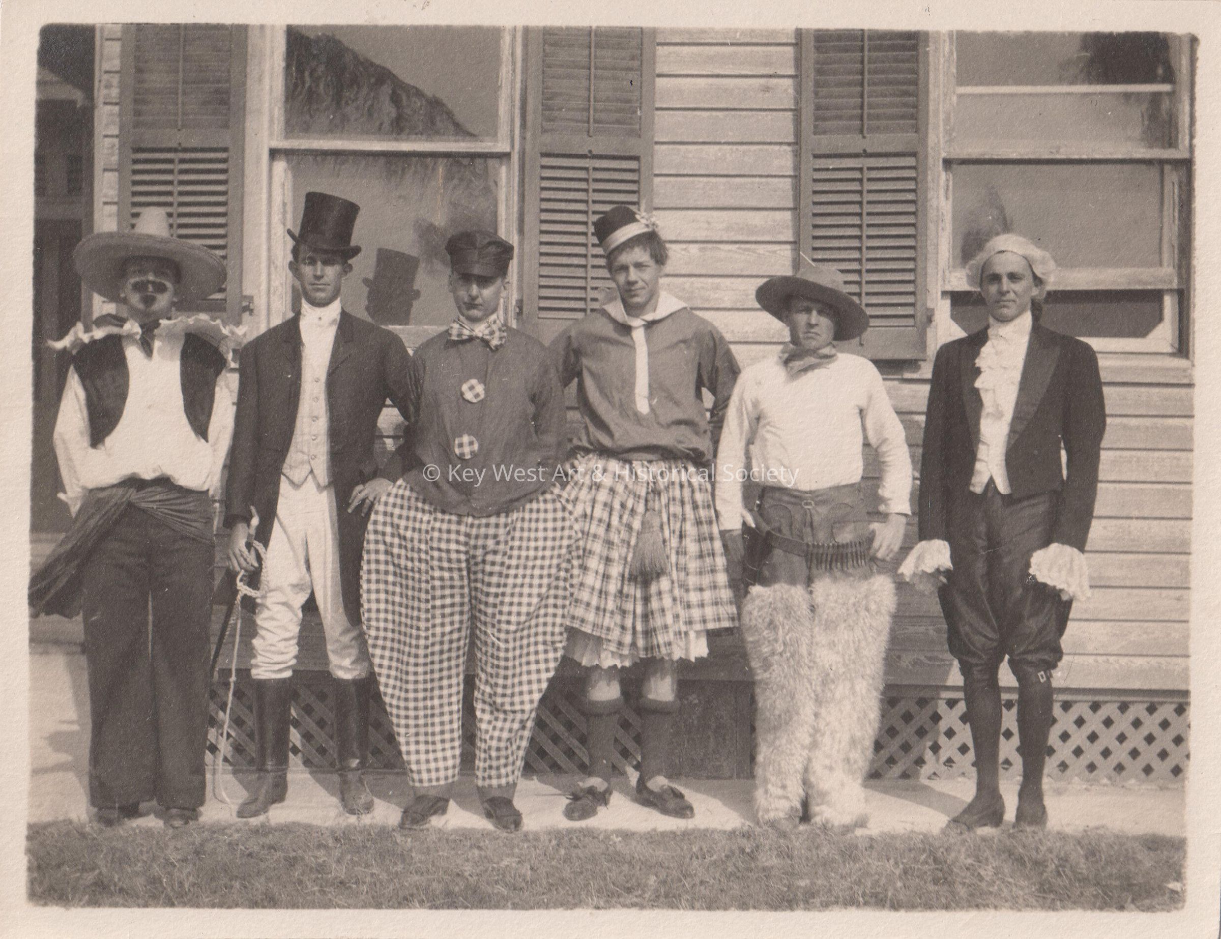 Black and white photograph of unknown men in costumes standing beside a house.Collection