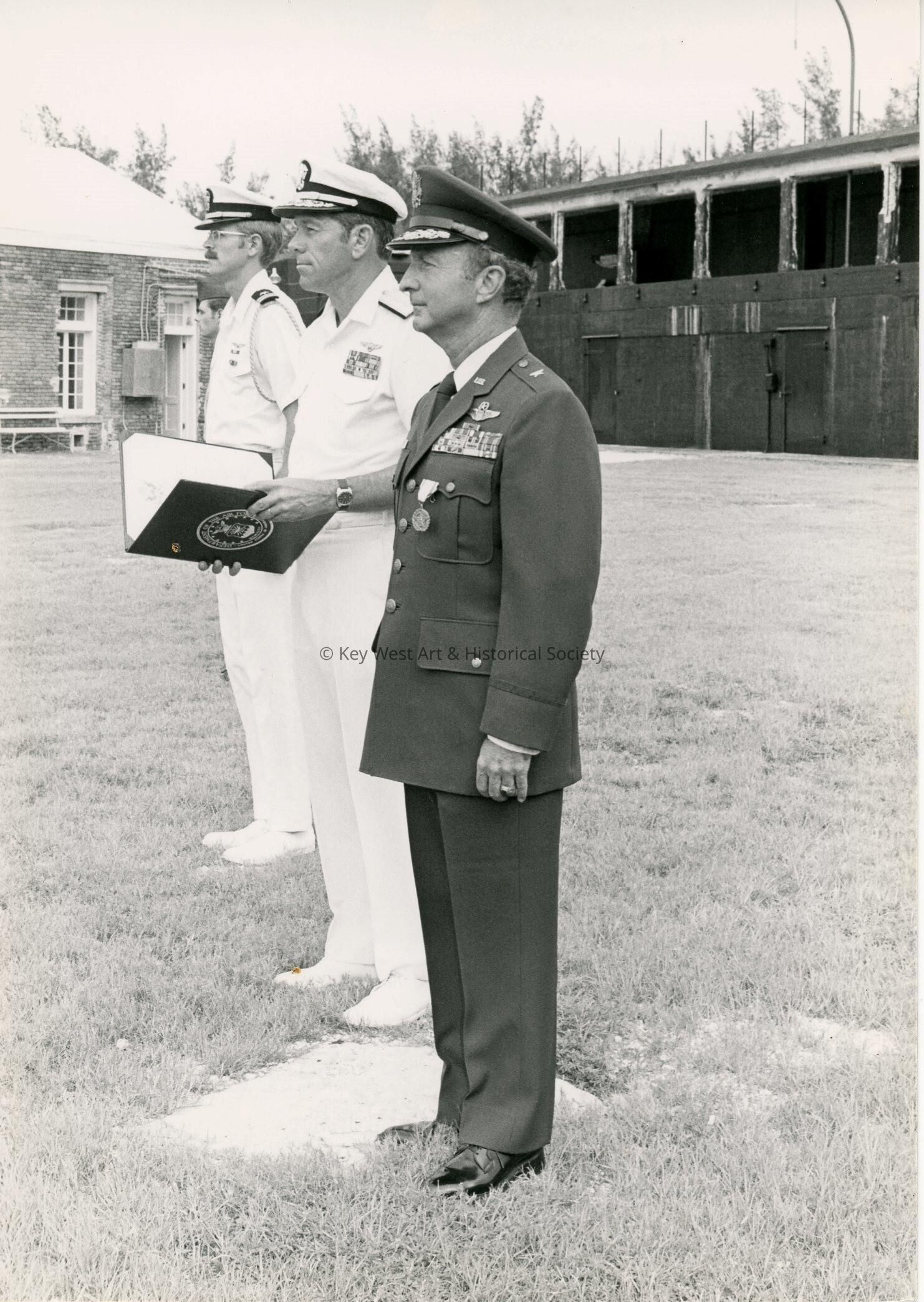 Unknown men in uniform standing outside.