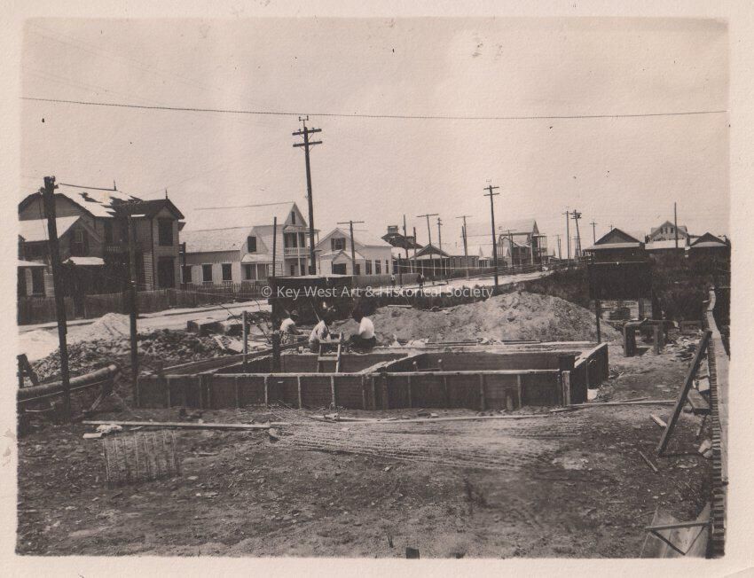 Black and white photo taken after the 1910 hurricane showing the storm damage. Image shows houses along one side of the street with some roof damage and a construction project on the other side of the street.Collection