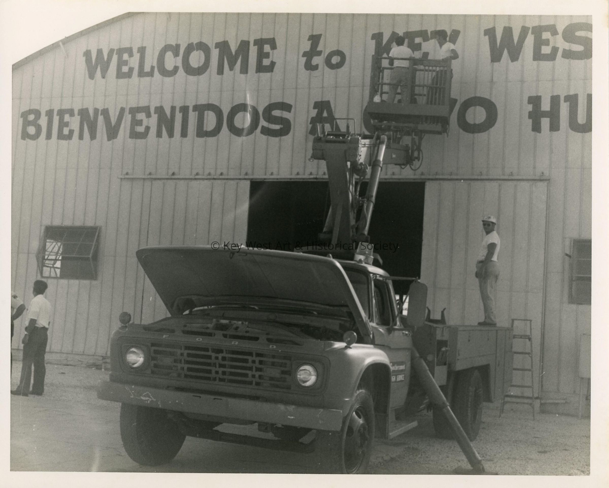 Unknown men on a truck putting up a welcome sign.Collection
