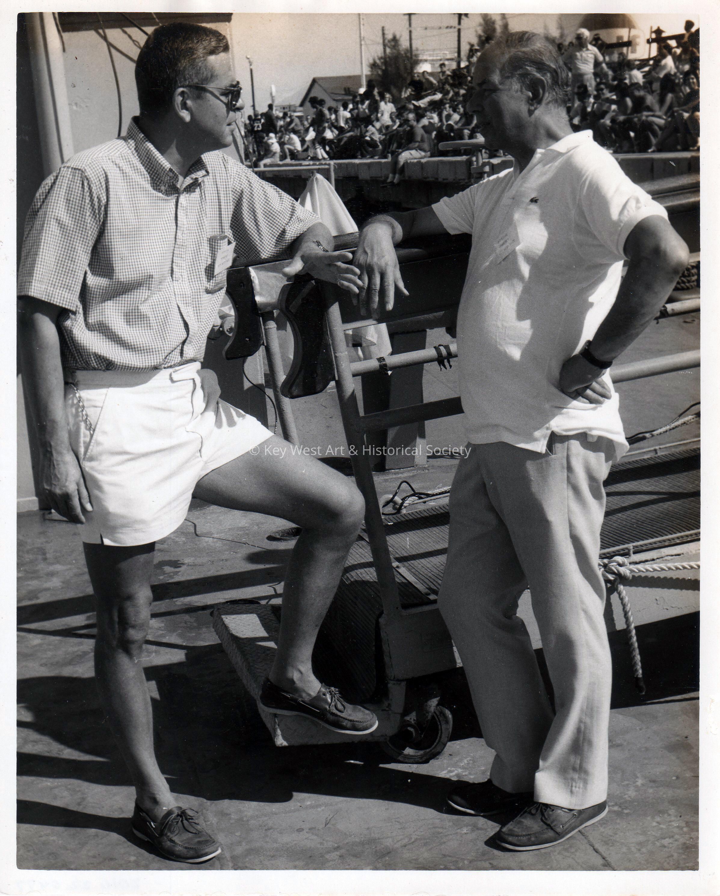 Black and white photograph of two unknown men standing on a gangway.