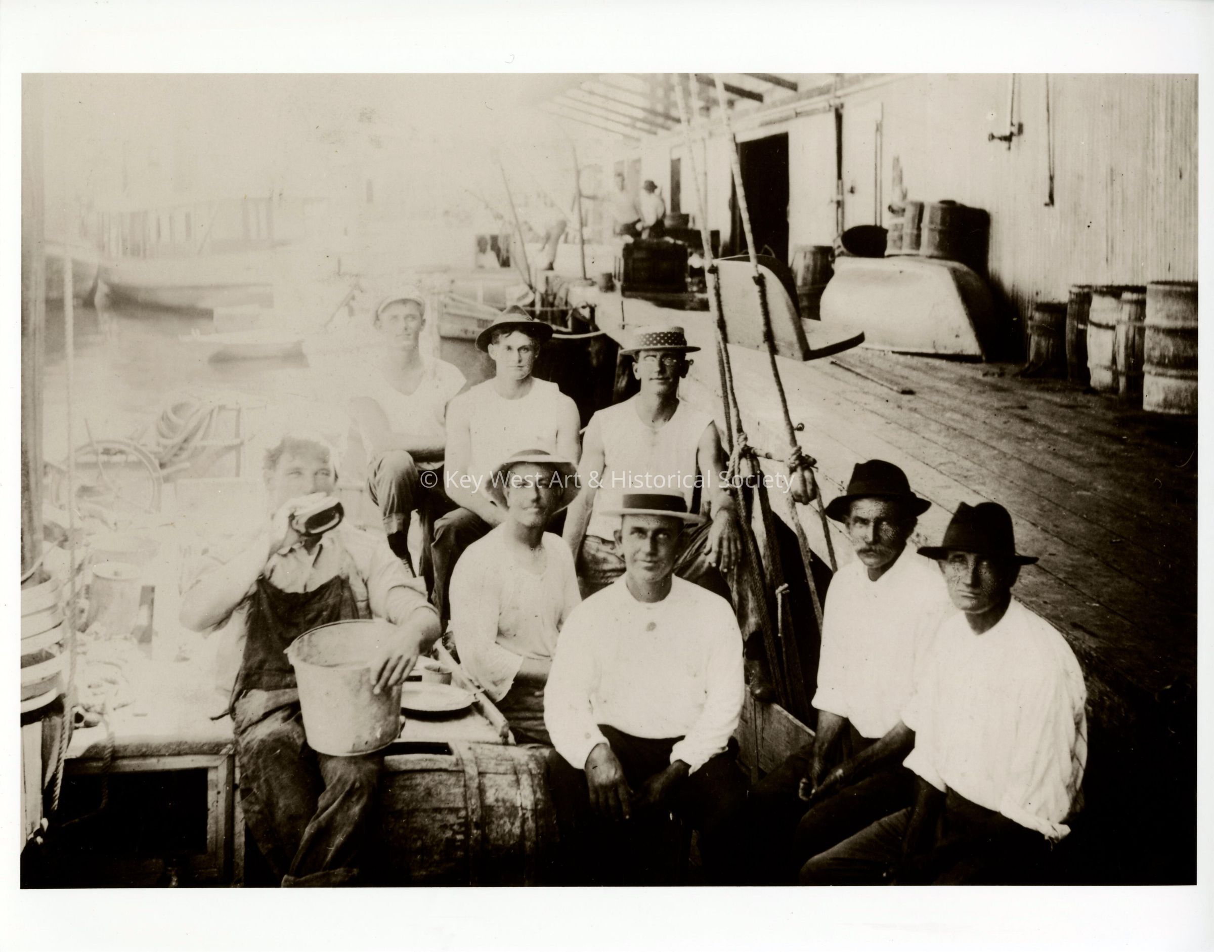 Black and white photograph of a group of unknown men sitting on a dock.