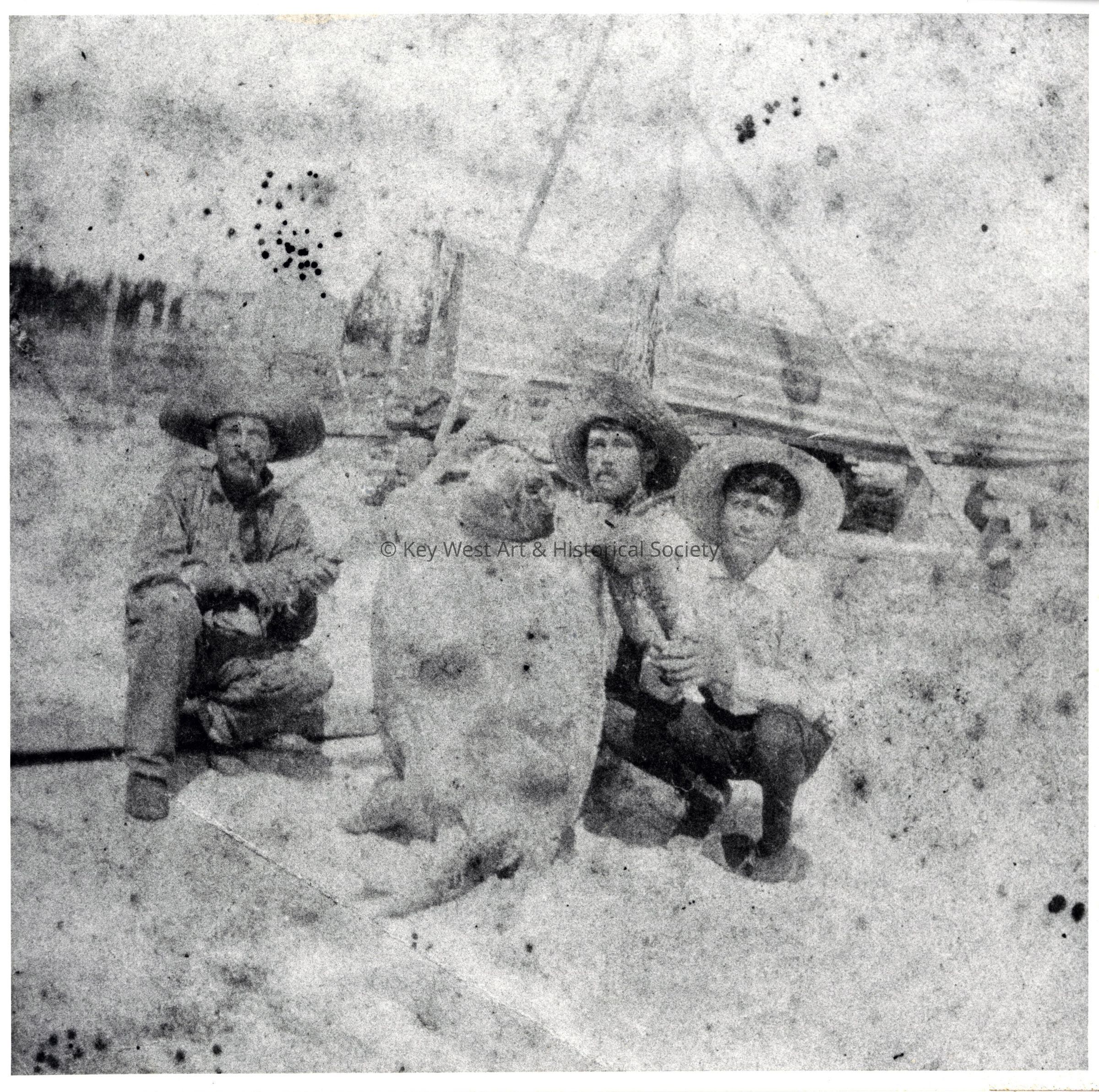 Black and white photograph of three unknown men with a large turtle.
