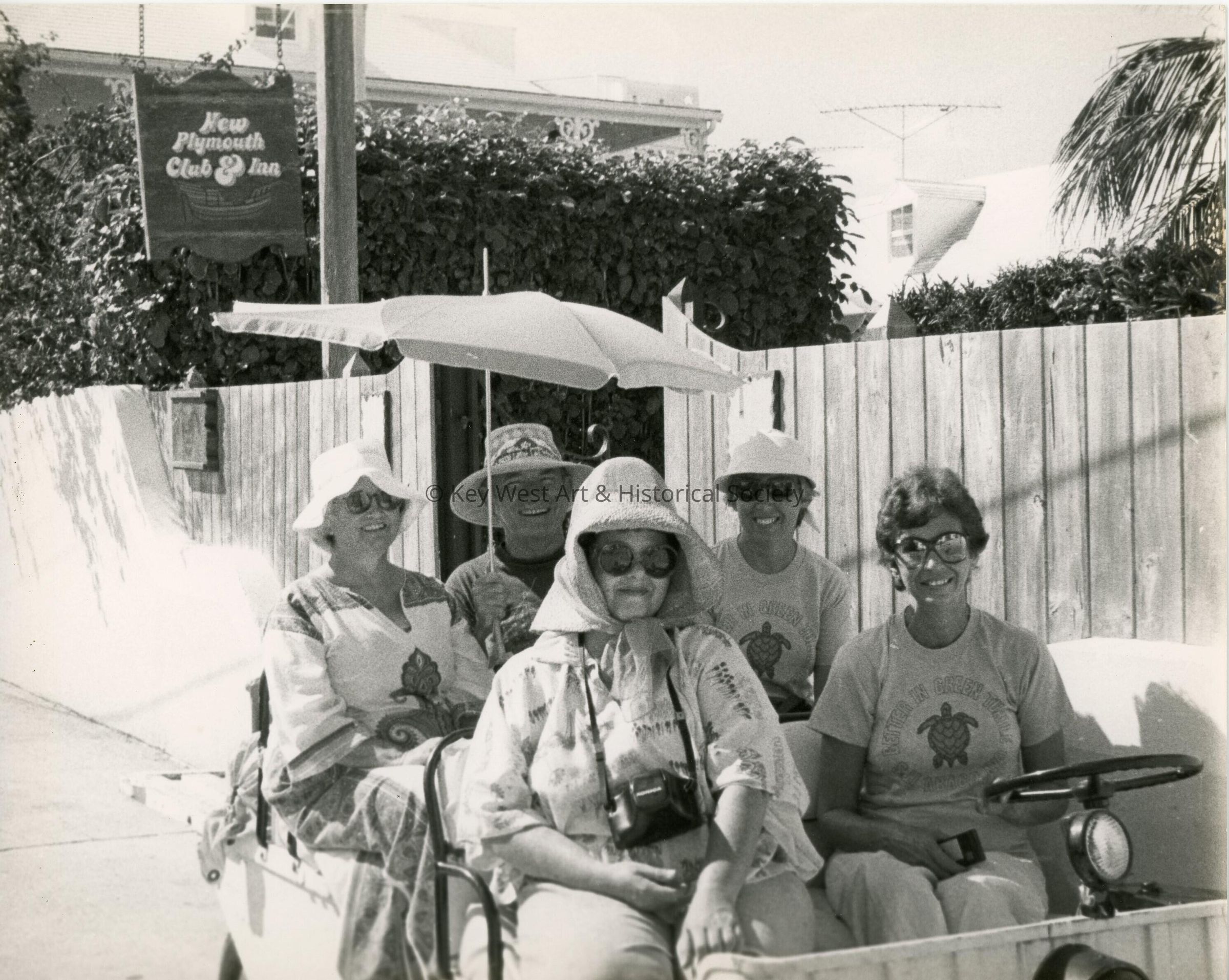 Black and white photograph of five unknown people sitting in a golf cart outside the New Plymouth Club & Inn. Possibly part of the Island Roots Festival.