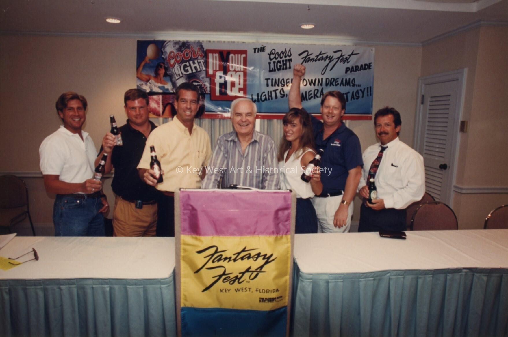 Unknown people at the podium, holding beers.Entry/Object ID