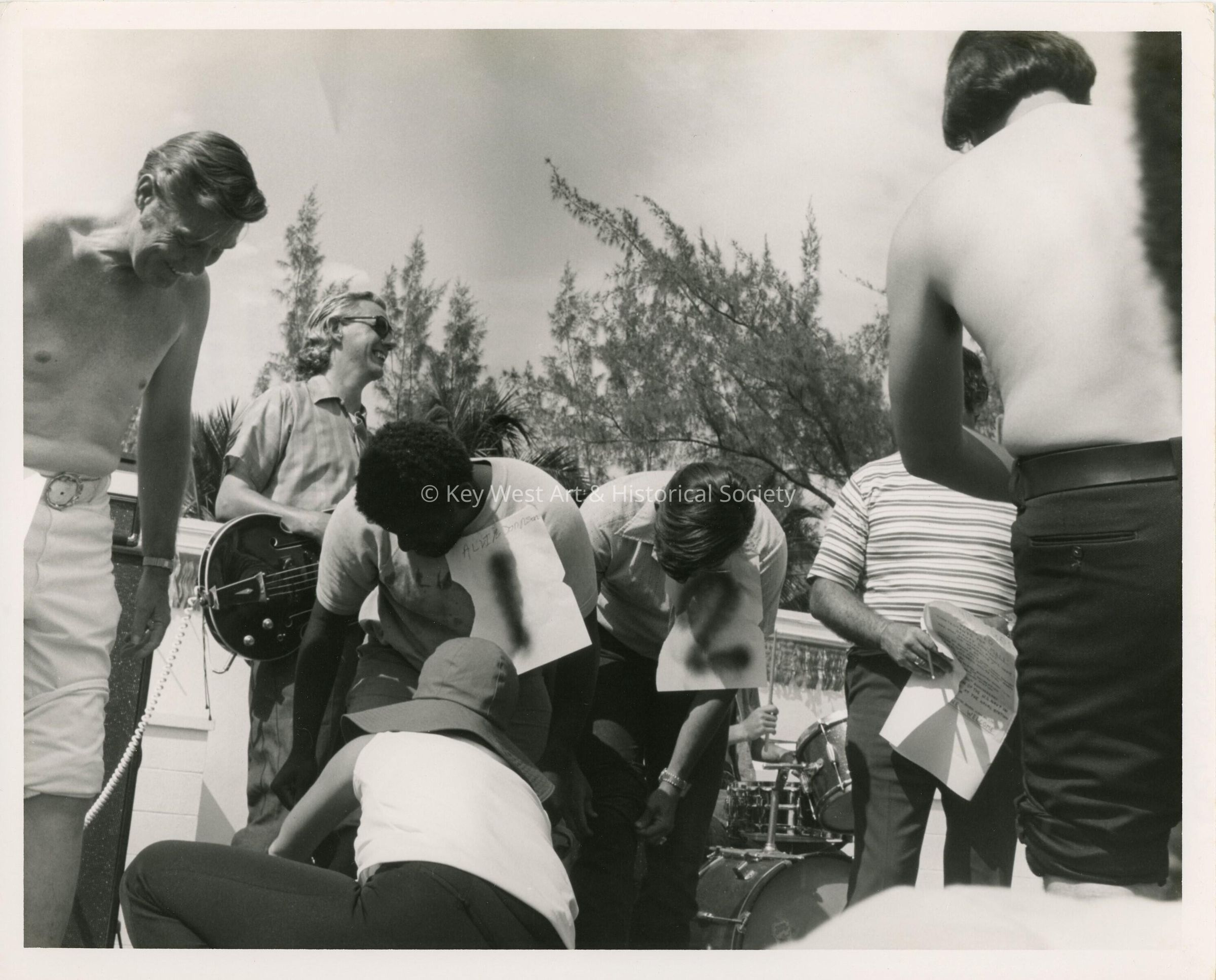 Unknown people bending down with a band playing next to themEntry/Object ID