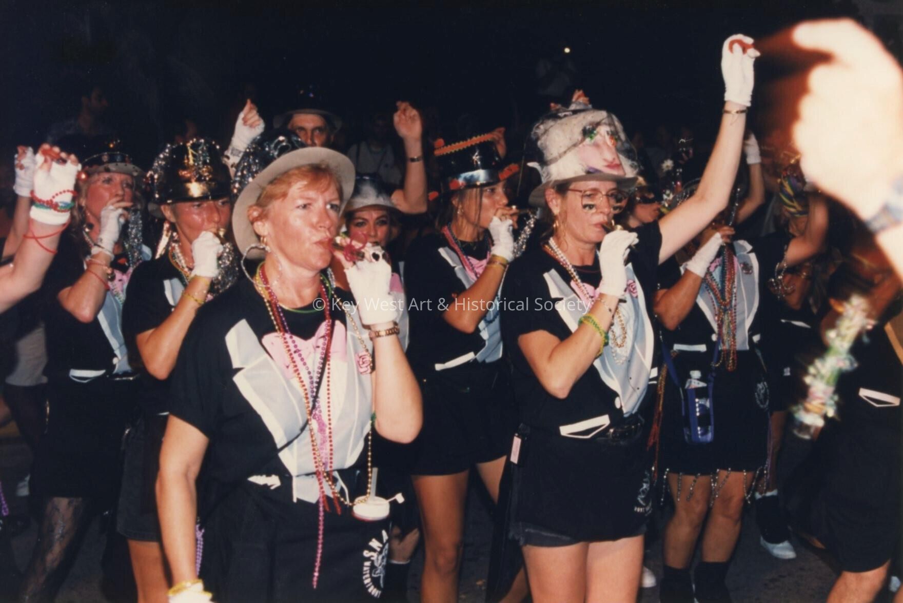 Unknown people dressed up blowing whistles in the parade.Entry/Object ID