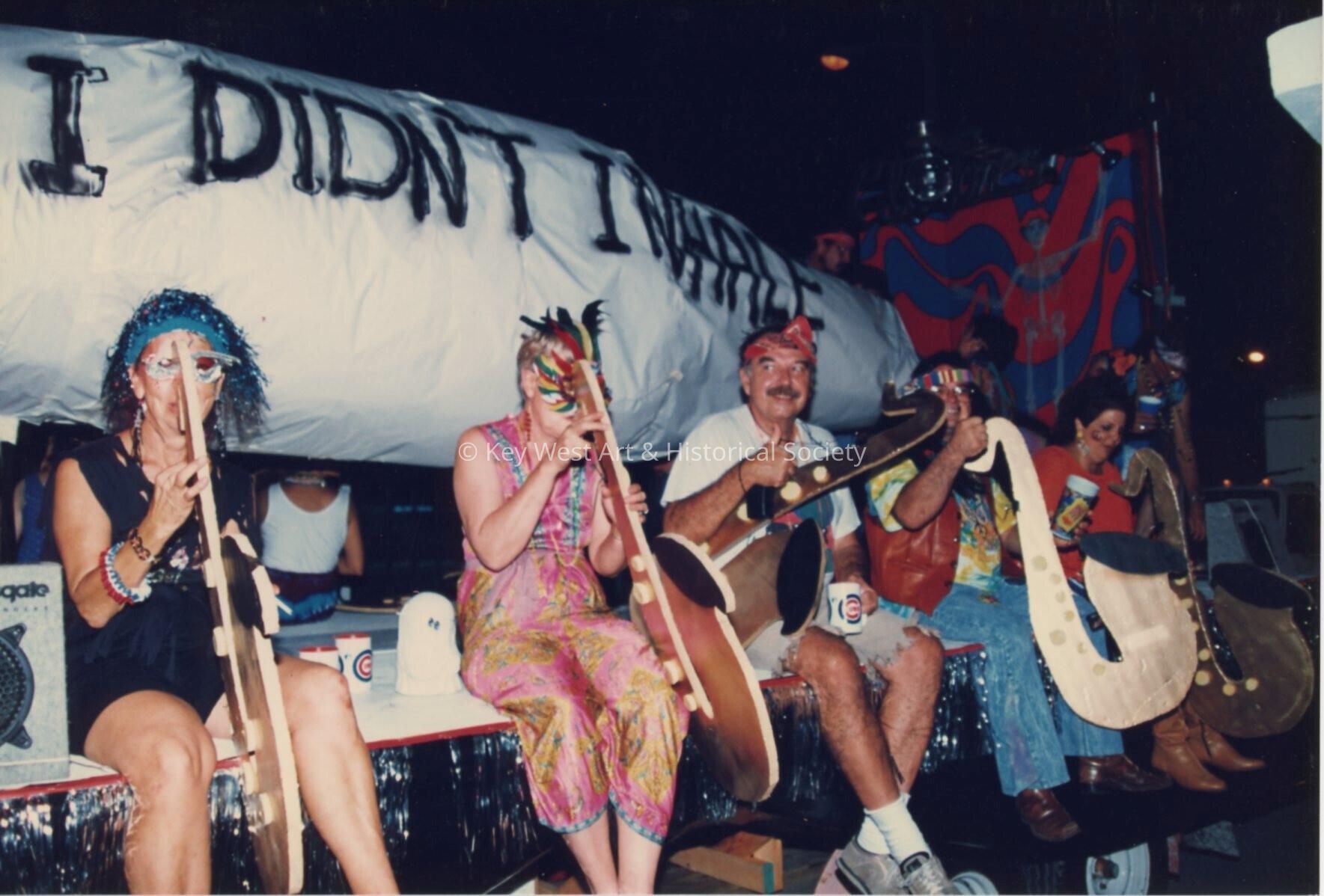 Unknown people dressed up on a float holding fake instruments.Entry/Object ID