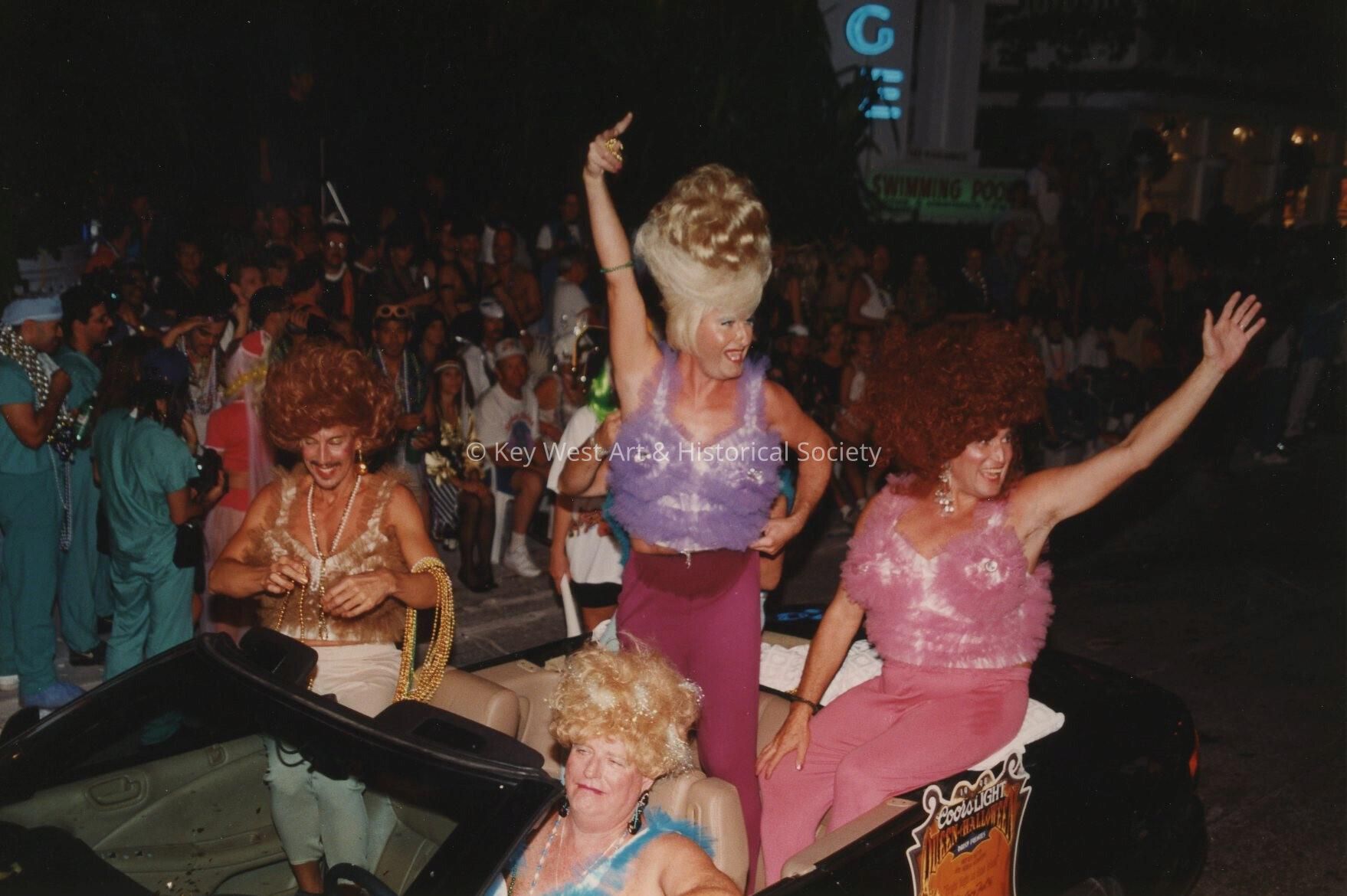 Unknown people dressed up on a float in the parade.Collection