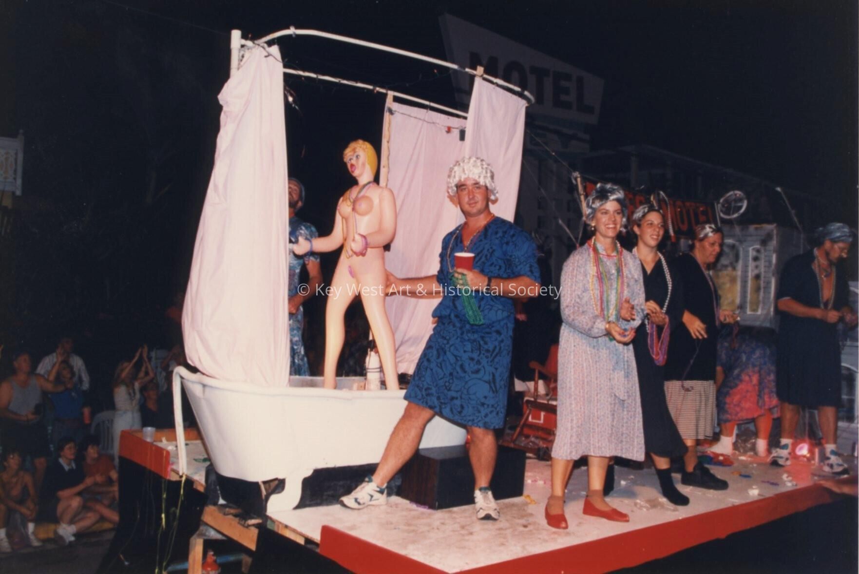 Unknown people dressed up on a float that reads Bates Motel.Entry/Object ID