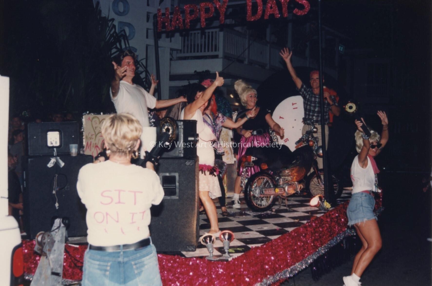 Unknown people dressed up on a float that reads Happy Days.Collection