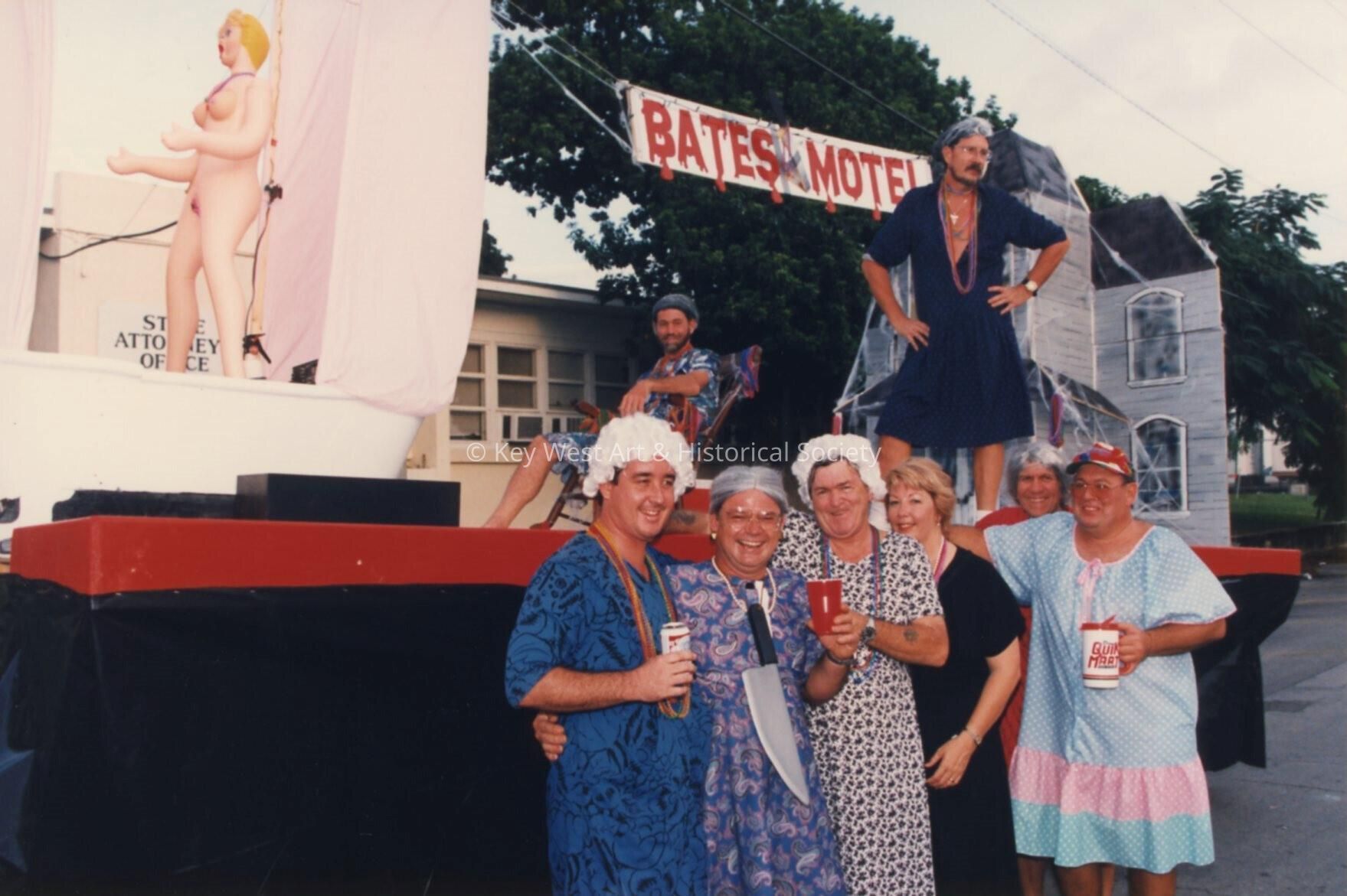 Unknown people dressed up standing in front of a float that reads Bates Motel.Collection