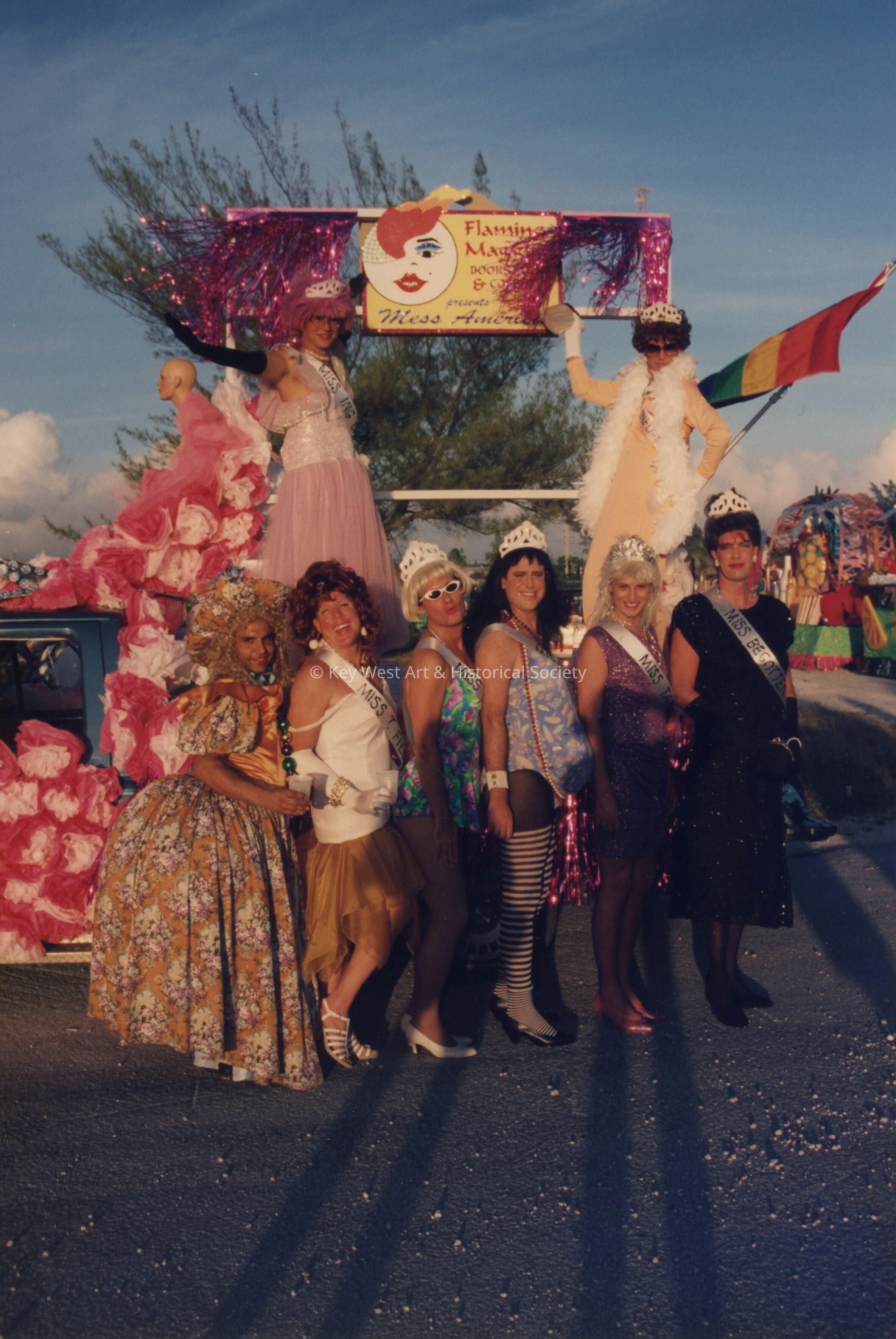 Unknown people dressed up standing in front of a float.Entry/Object ID