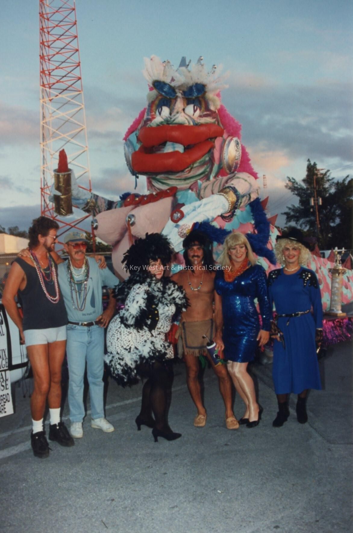 Unknown people dressed up standing near a float.Collection
