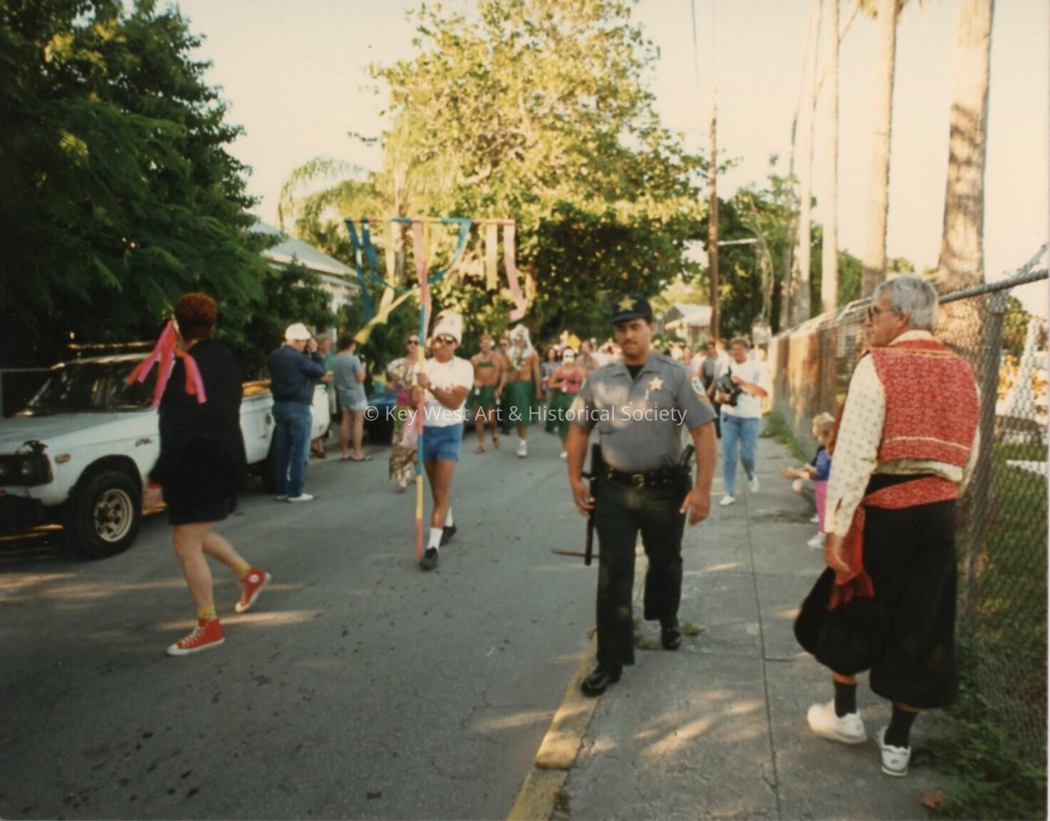 Unknown people dressed up walking down the street in a parade.Entry/Object ID