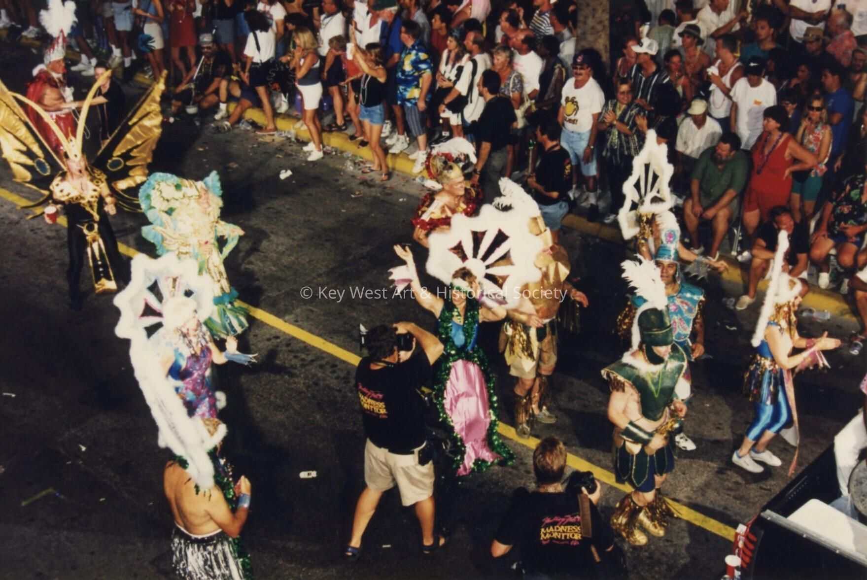 Unknown people dressed up walking down the street in the parade.Entry/Object ID