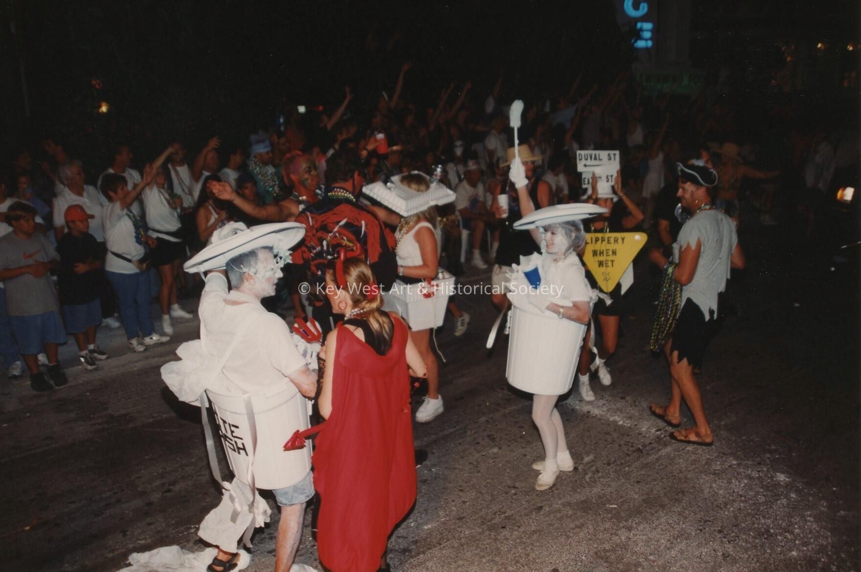 Unknown people dressed up walking in the street for the parade.Entry/Object ID
