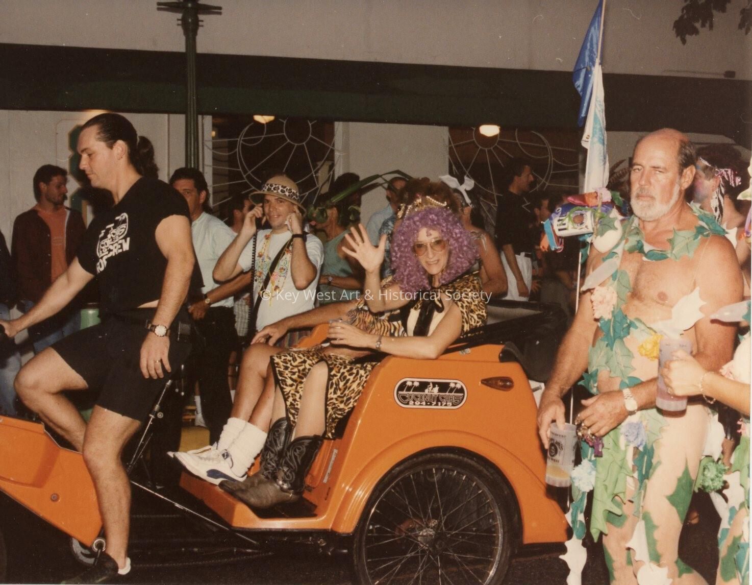 Unknown people on a pedicab dressed up, and many walking around.Entry/Object ID