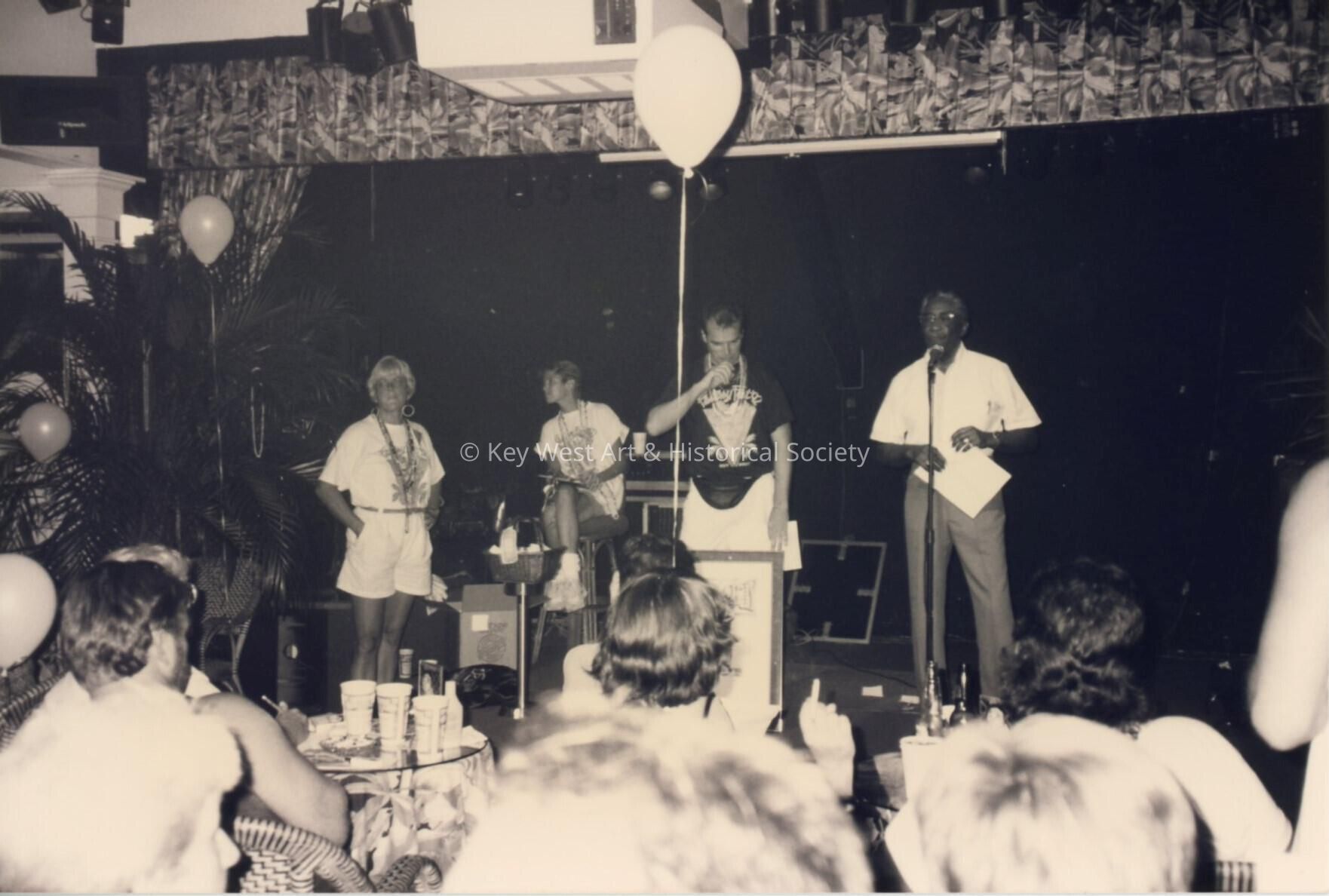 Unknown people on a stage with unknown people sitting at tables.Collection