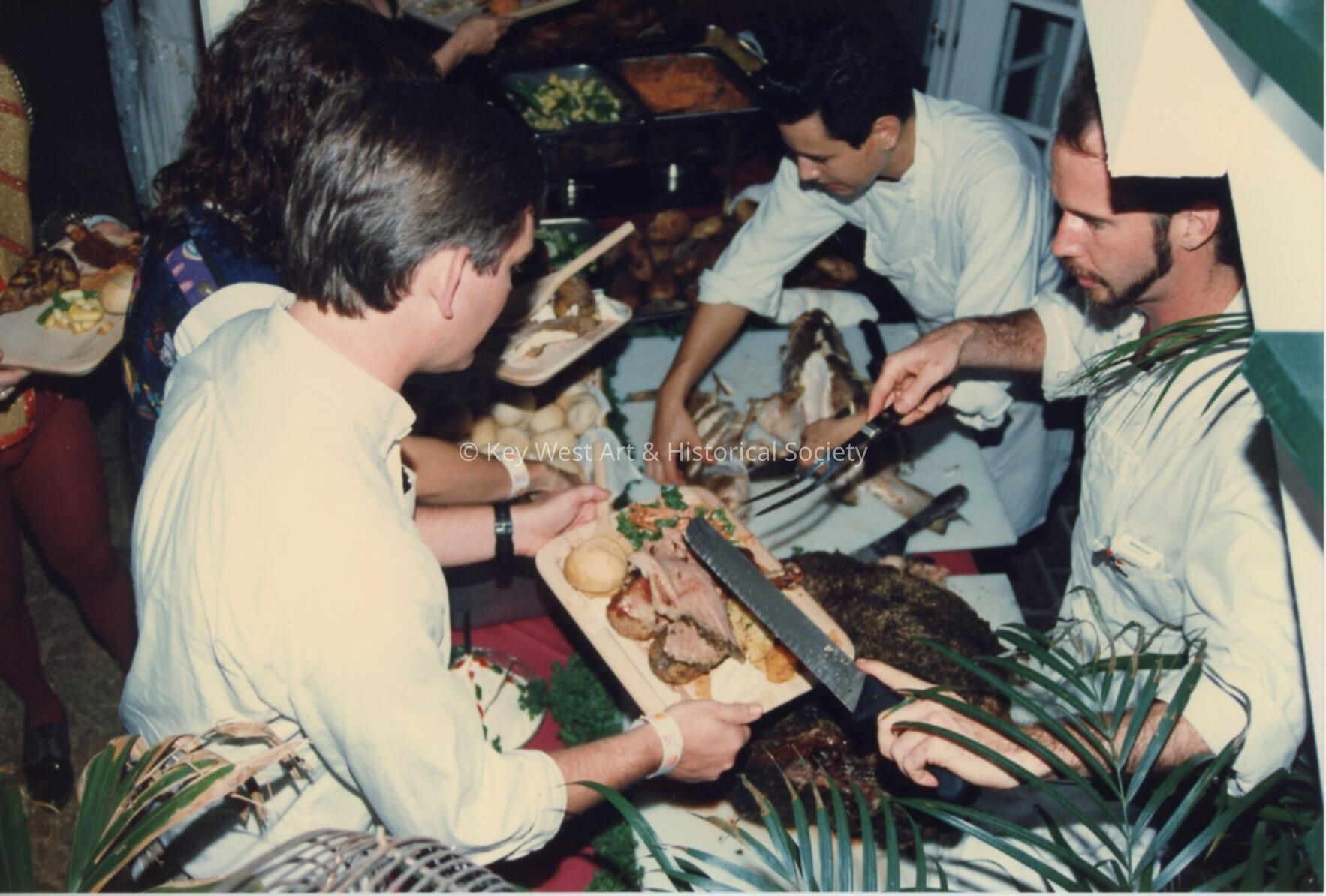 Unknown people serving themselves food from a buffet table.Entry/Object ID