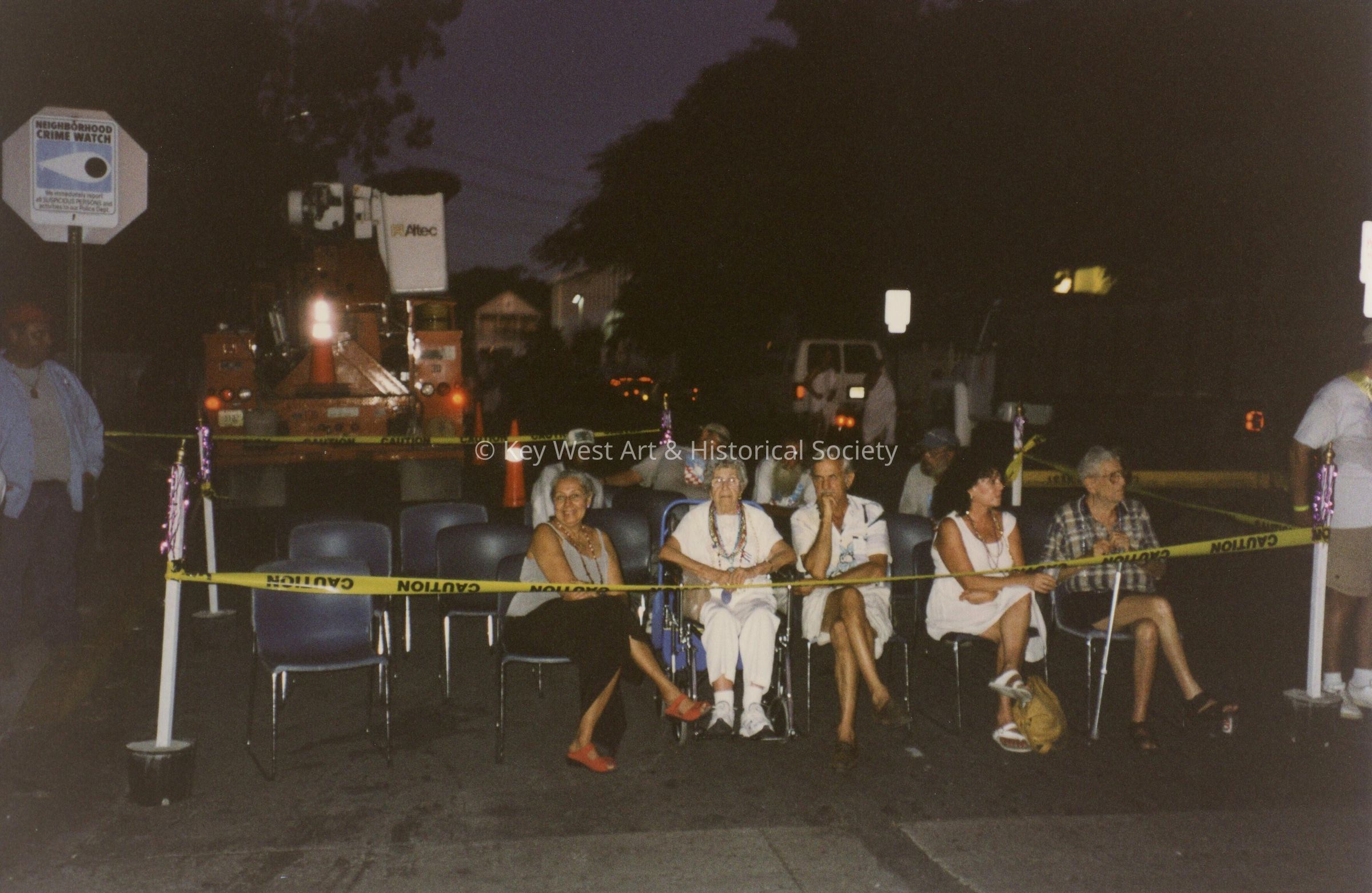 Unknown people sitting on chairs in a taped off area.Entry/Object ID