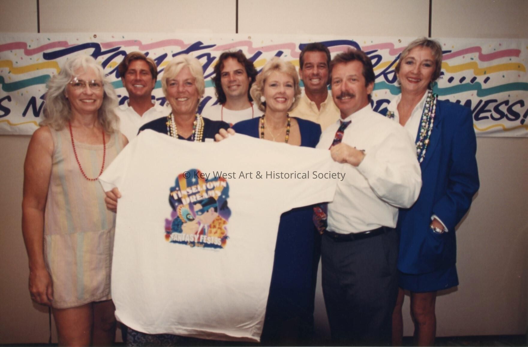 Unknown people standing if front of the Fantasy Fest sign holding a T shirt.Collection