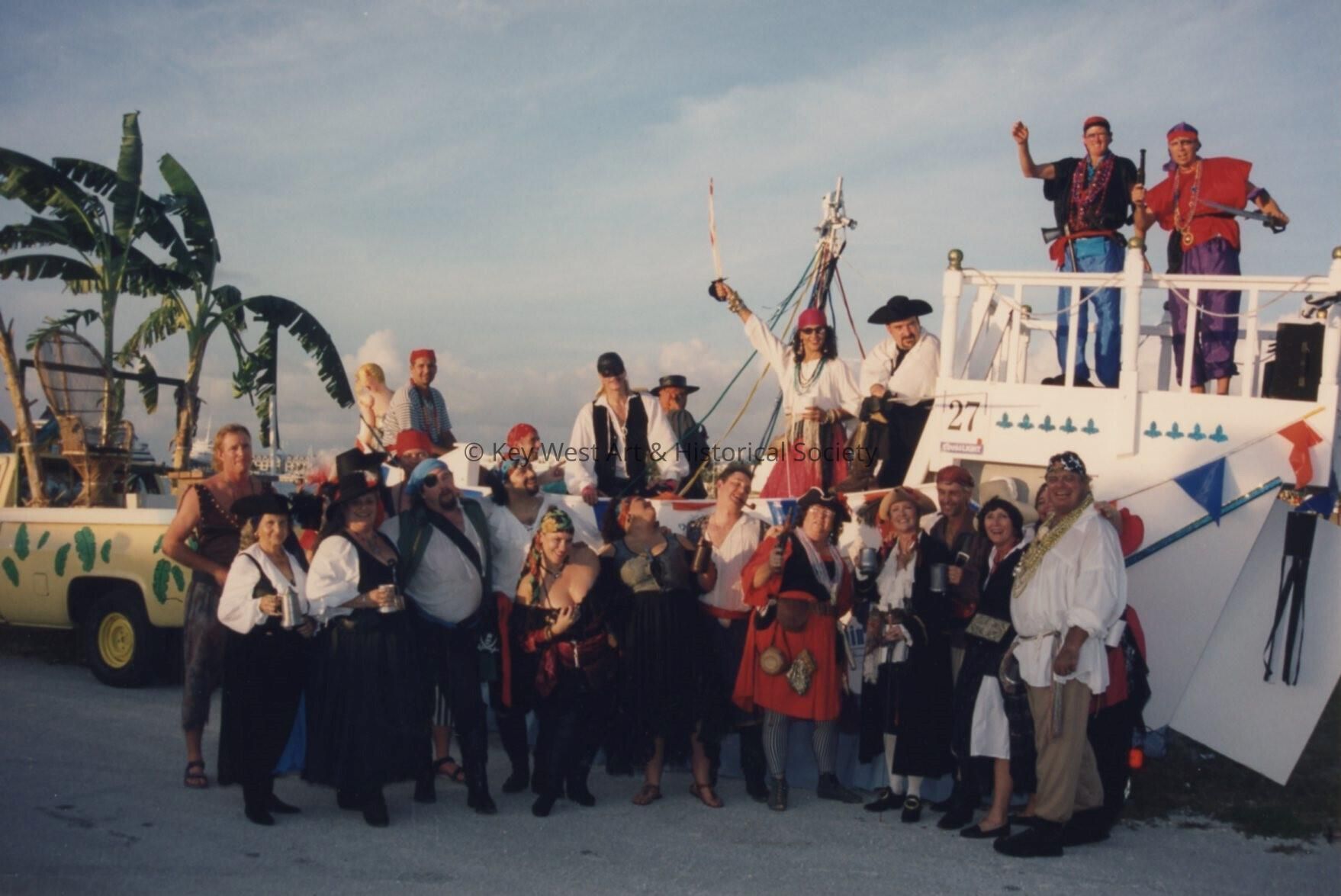 Unknown people standing in front of float number 27.Entry/Object ID