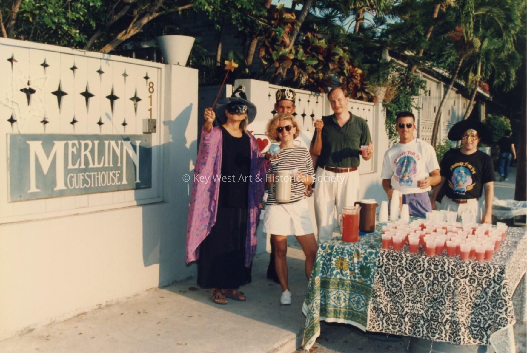 Unknown people standing in front of the Merlin Guesthouse during the Masquerade March.Entry/Object ID