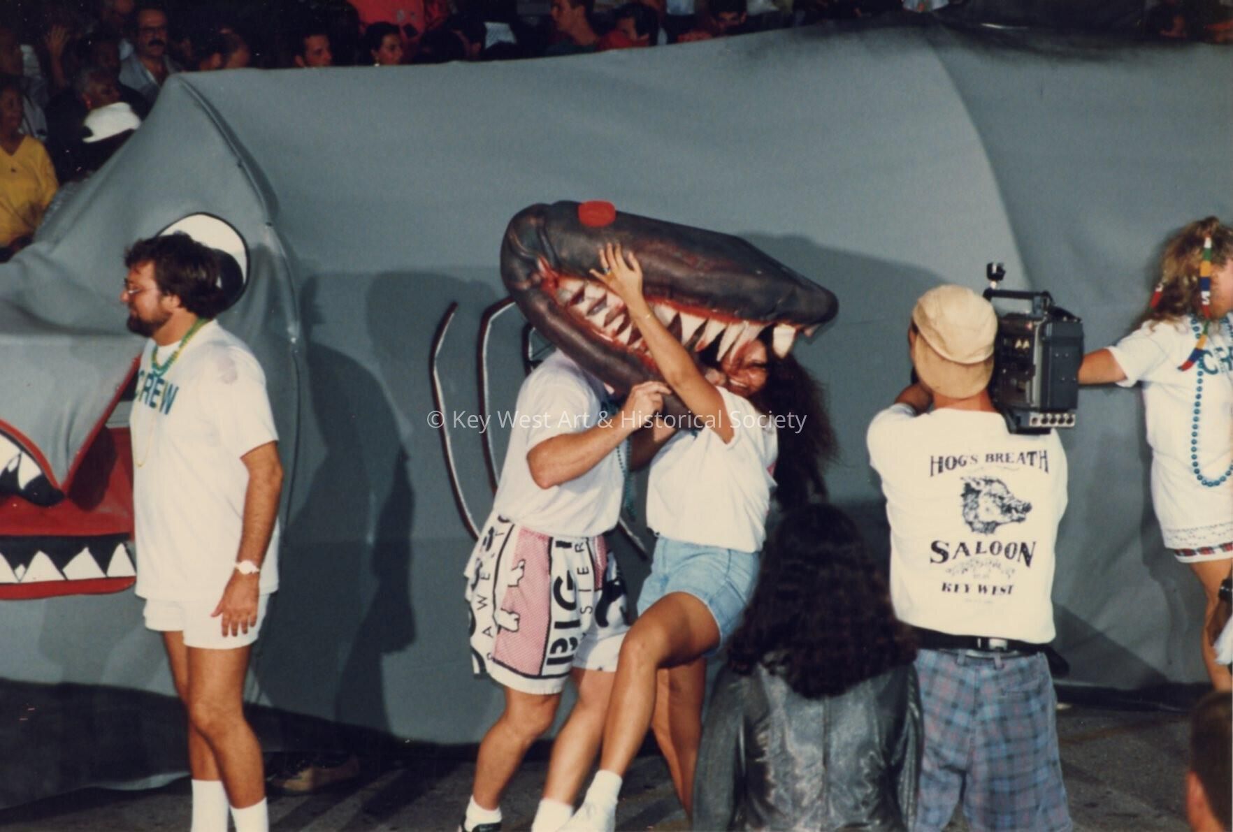 Unknown people walking with a float, while someone is recording them.Entry/Object ID