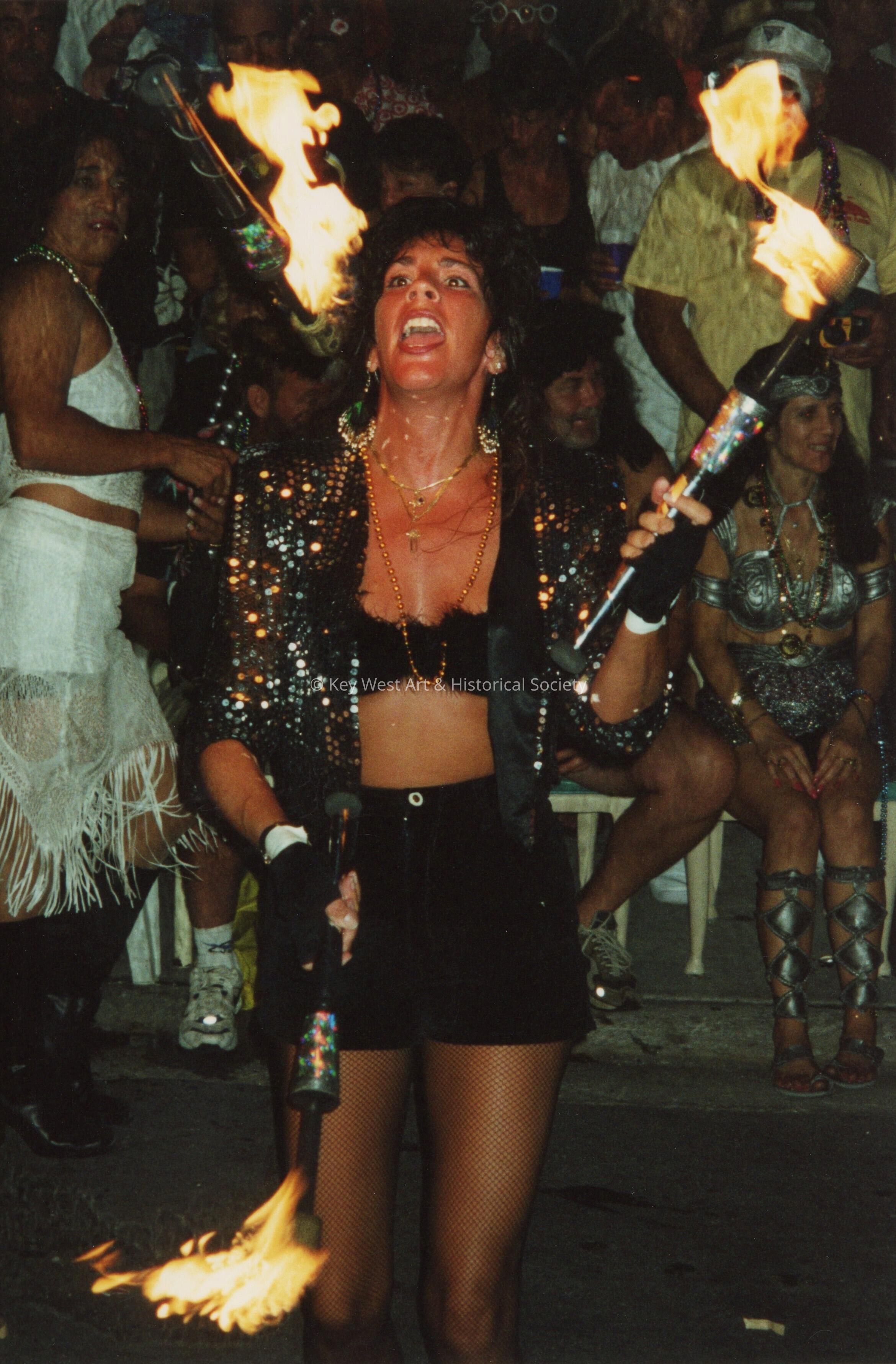 Unknown person dressed up juggling with fire.