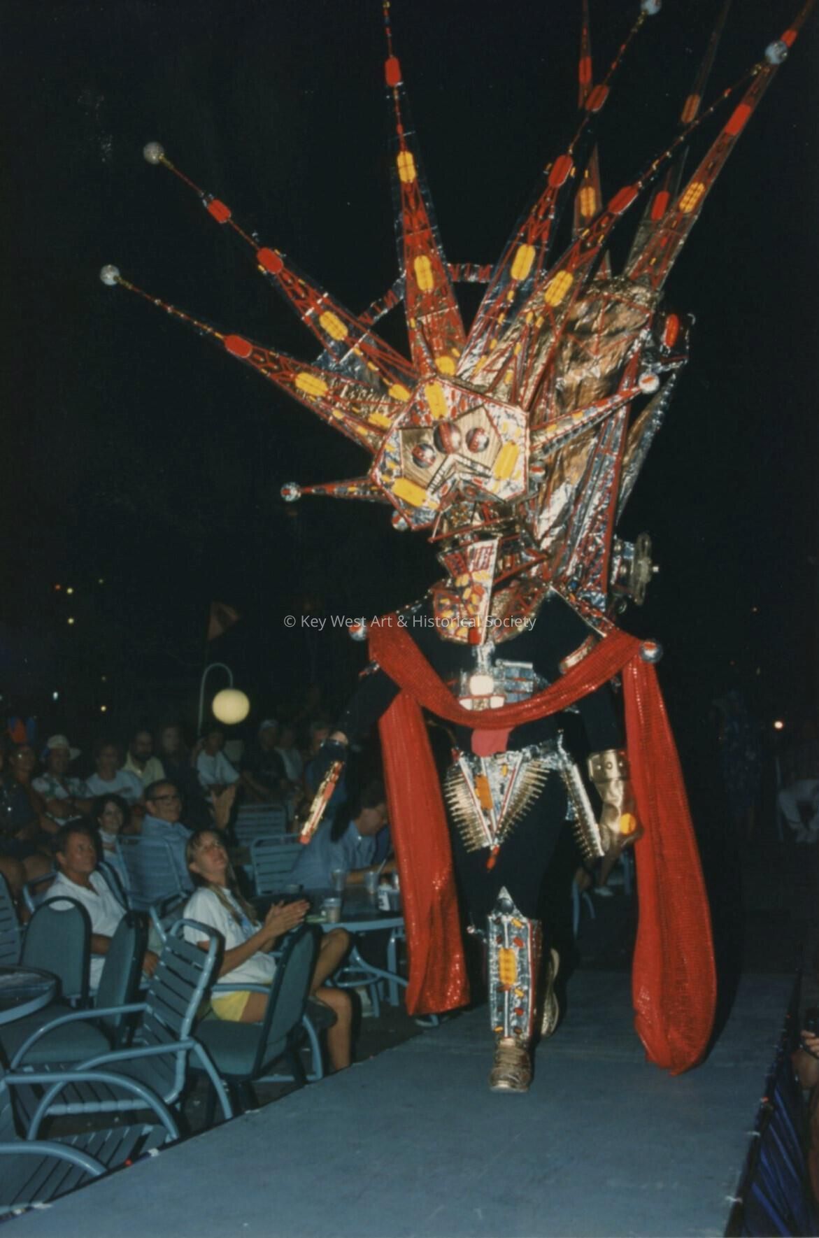 Unknown person dressed up walking down a run way with on lookers.Entry/Object ID